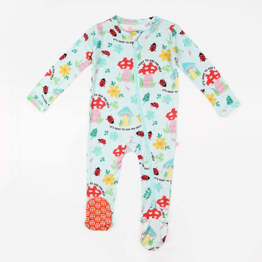 Magic Mushroom | Bamboo Footie Onesie Sleeper | "It's Okay to Ask for Help" | Thermo-Regulating, Double Zipper, 4-Way Stretch