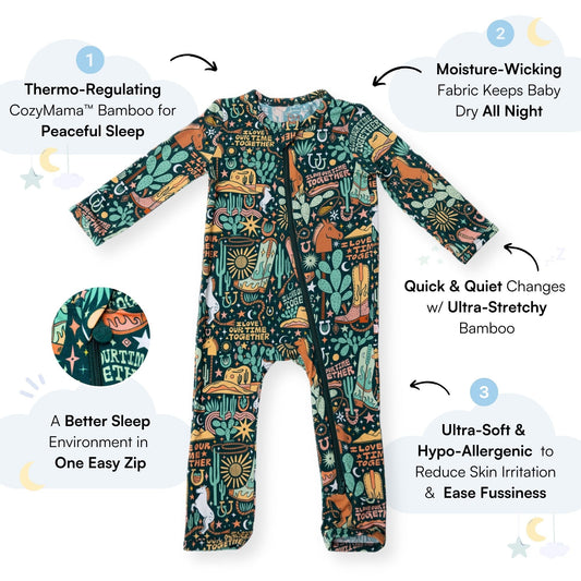 Wild West | Bamboo Footless Onesie Romper | "I Love Our Time Together" | Thermo-Regulating, Double Zipper, 4-Way Stretch
