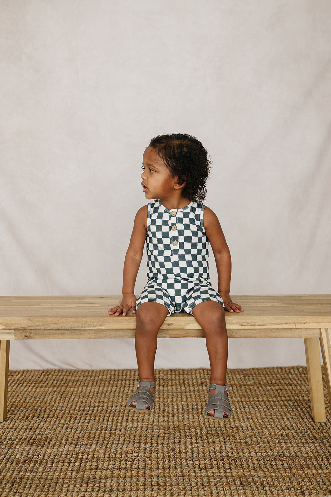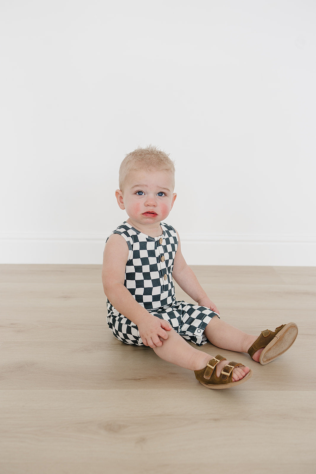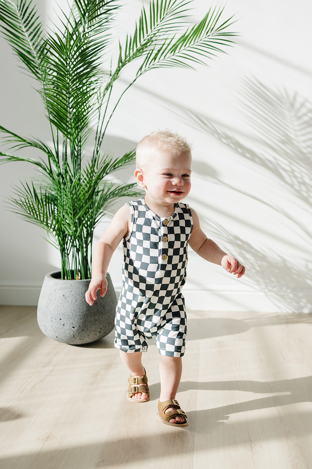 Get ready for sunny days with this stylish charcoal wavy checkered short romper! The fresh pattern adds a touch of fun, while the relaxed fit and sleeveless and shorts design make it perfect for keeping cool on hot summer days. Whether they’re running around the playground or enjoying a family day out, this romper is as comfy as it is cute, making it a must-have for any little one. They have wood buttons on the front that add such a cute detail. We also added snaps on the bottom for easy diaper changes!