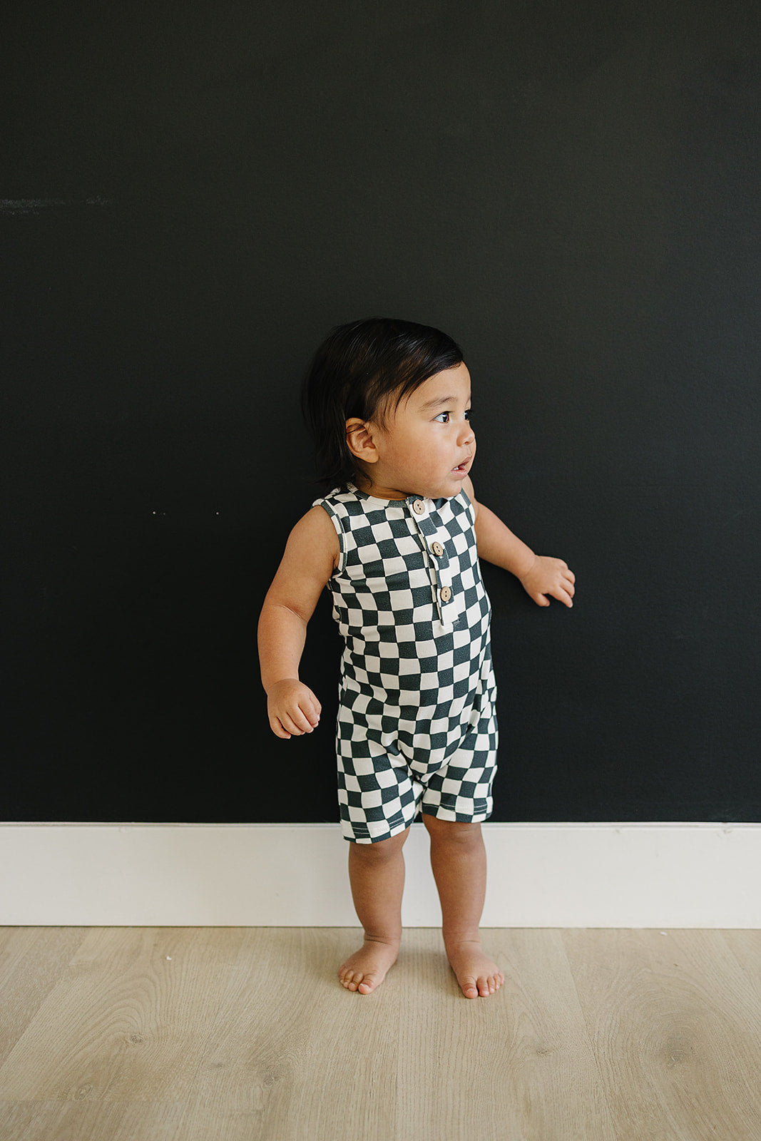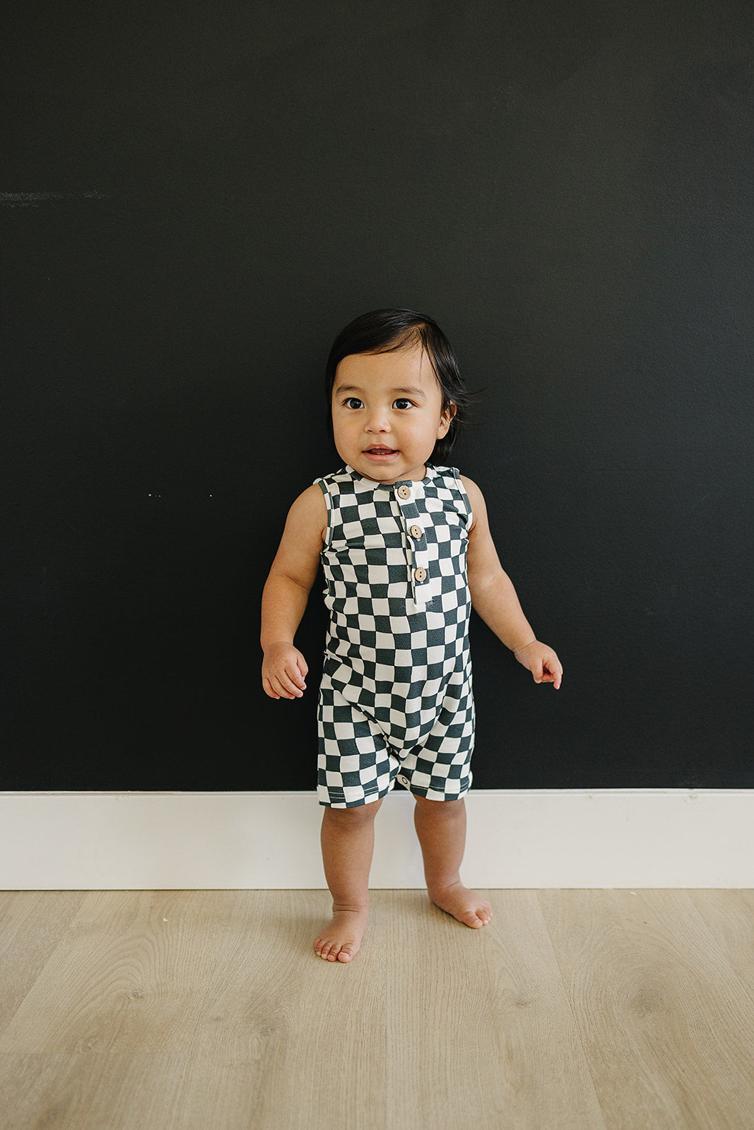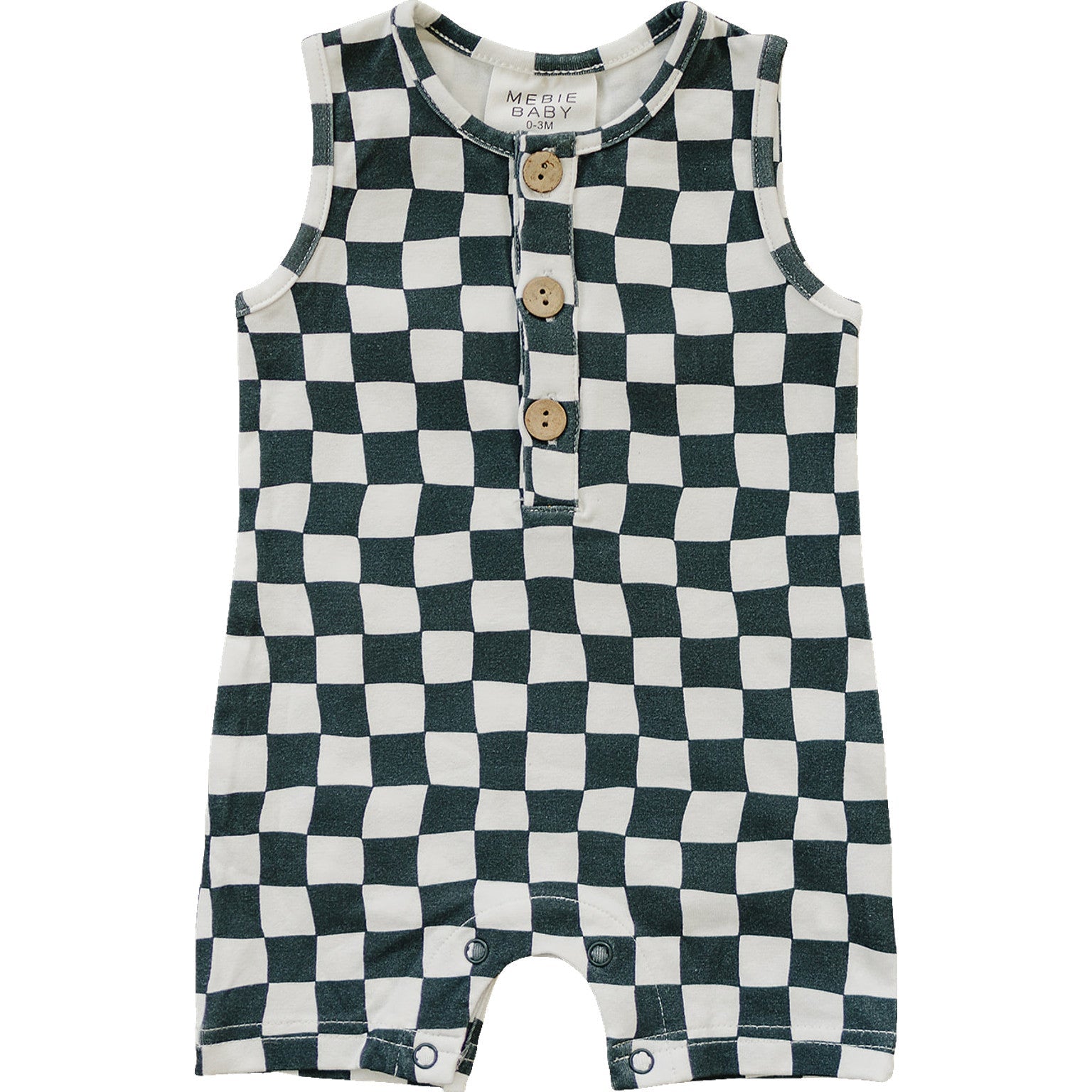 Get ready for sunny days with this stylish charcoal wavy checkered short romper! The fresh pattern adds a touch of fun, while the relaxed fit and sleeveless and shorts design make it perfect for keeping cool on hot summer days. Whether they’re running around the playground or enjoying a family day out, this romper is as comfy as it is cute, making it a must-have for any little one. They have wood buttons on the front that add such a cute detail. We also added snaps on the bottom for easy diaper changes!