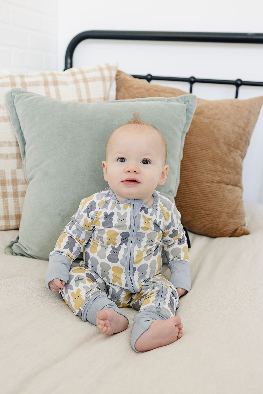 Jump into spring with the charm of our Dusty Blue Bunny Bamboo Zipper, perfect for cozy days and nights. Made from soft and breathable bamboo fabric, this zipper sleeper ensures comfort for your baby in sizes ranging from 0-3 to 18 months. The classic bunny design adds a playful spring touch, making it ideal for Easter!Â