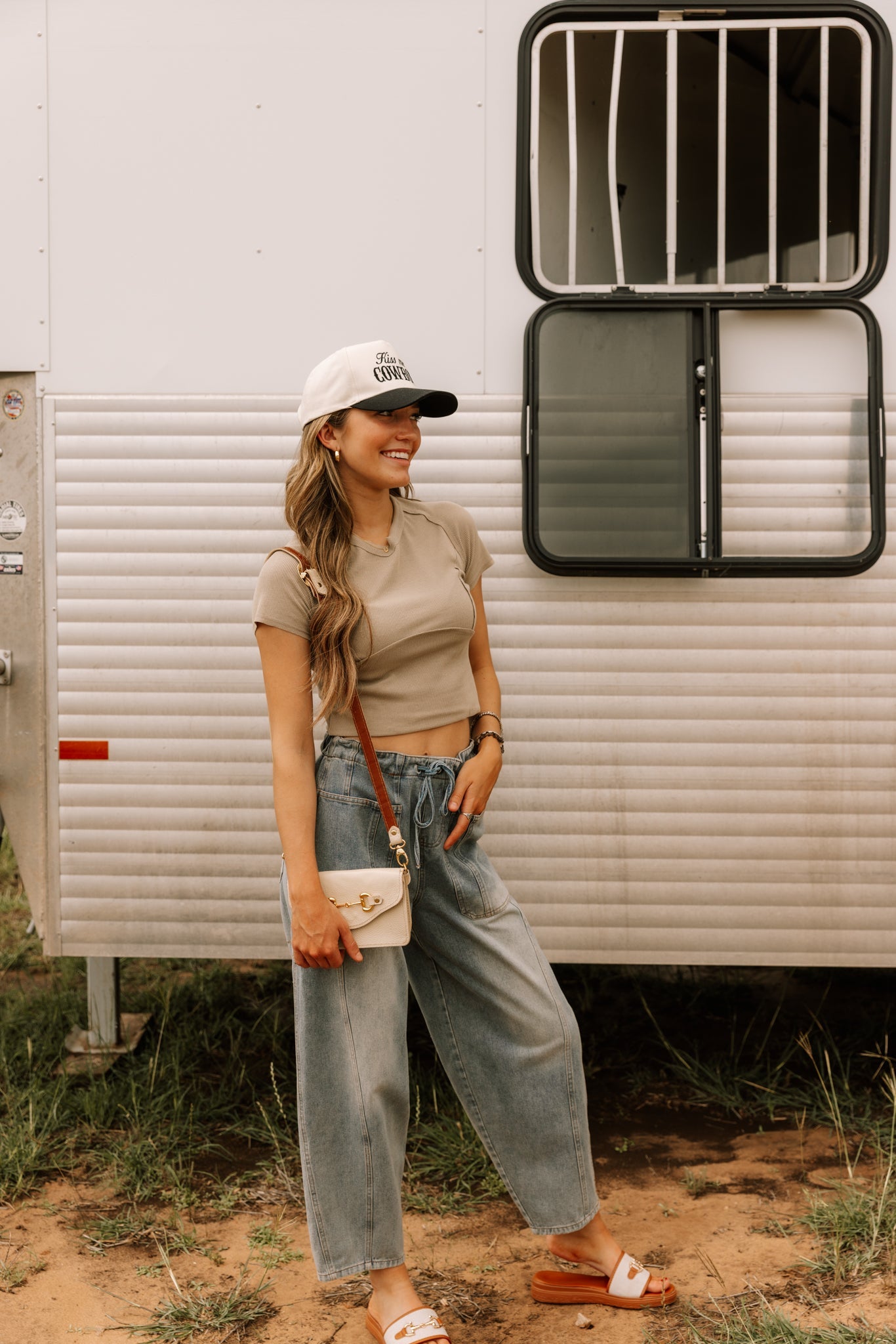 A two-tone classic with a flirty twist. Features bold “Kiss Me Cowboy” embroidery and an easy, everyday fit. Western, effortless, and just a little bold.