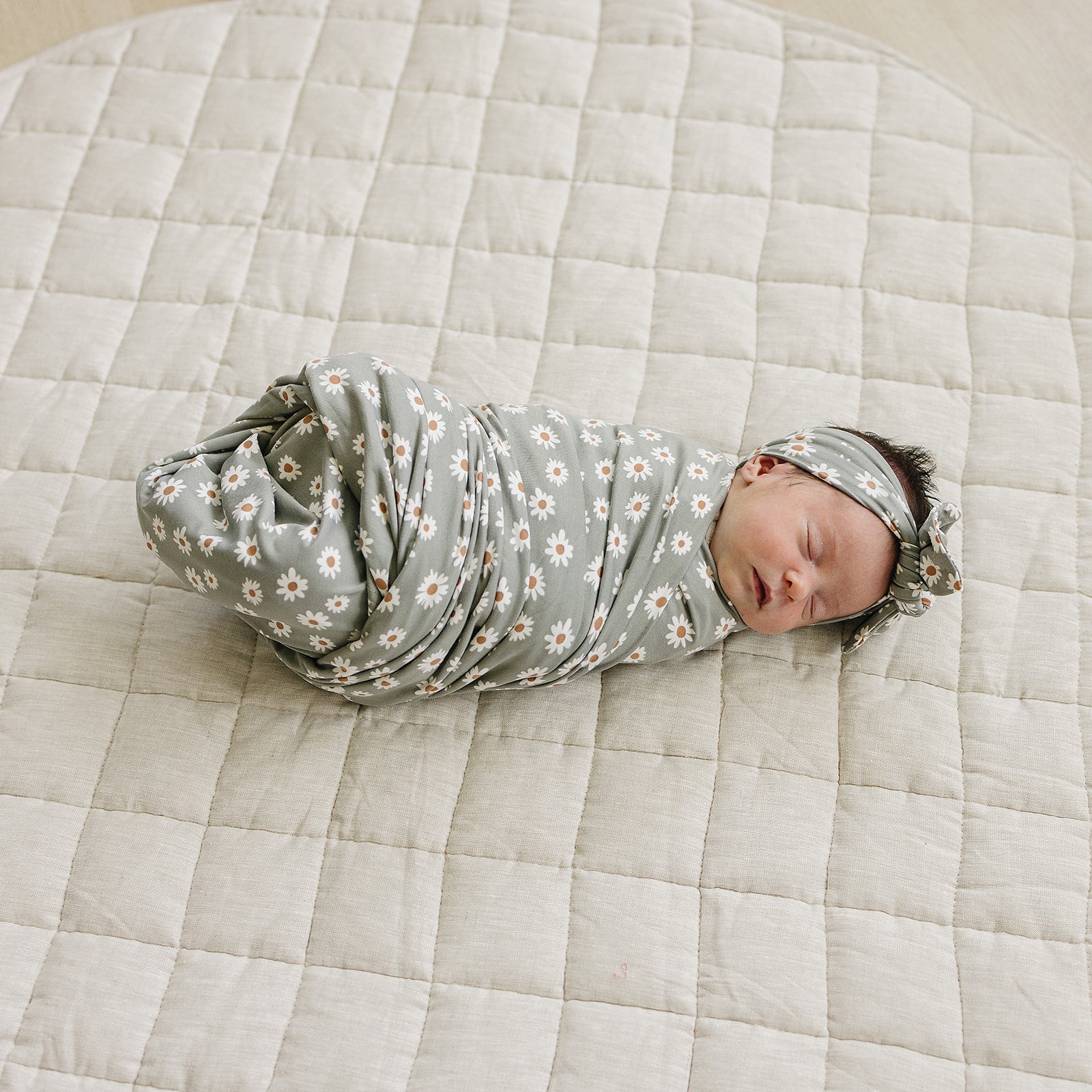 This is a one size head wrap that will fit size newborn and up. It is made out of the same fabric as our bamboo stretch swaddles.