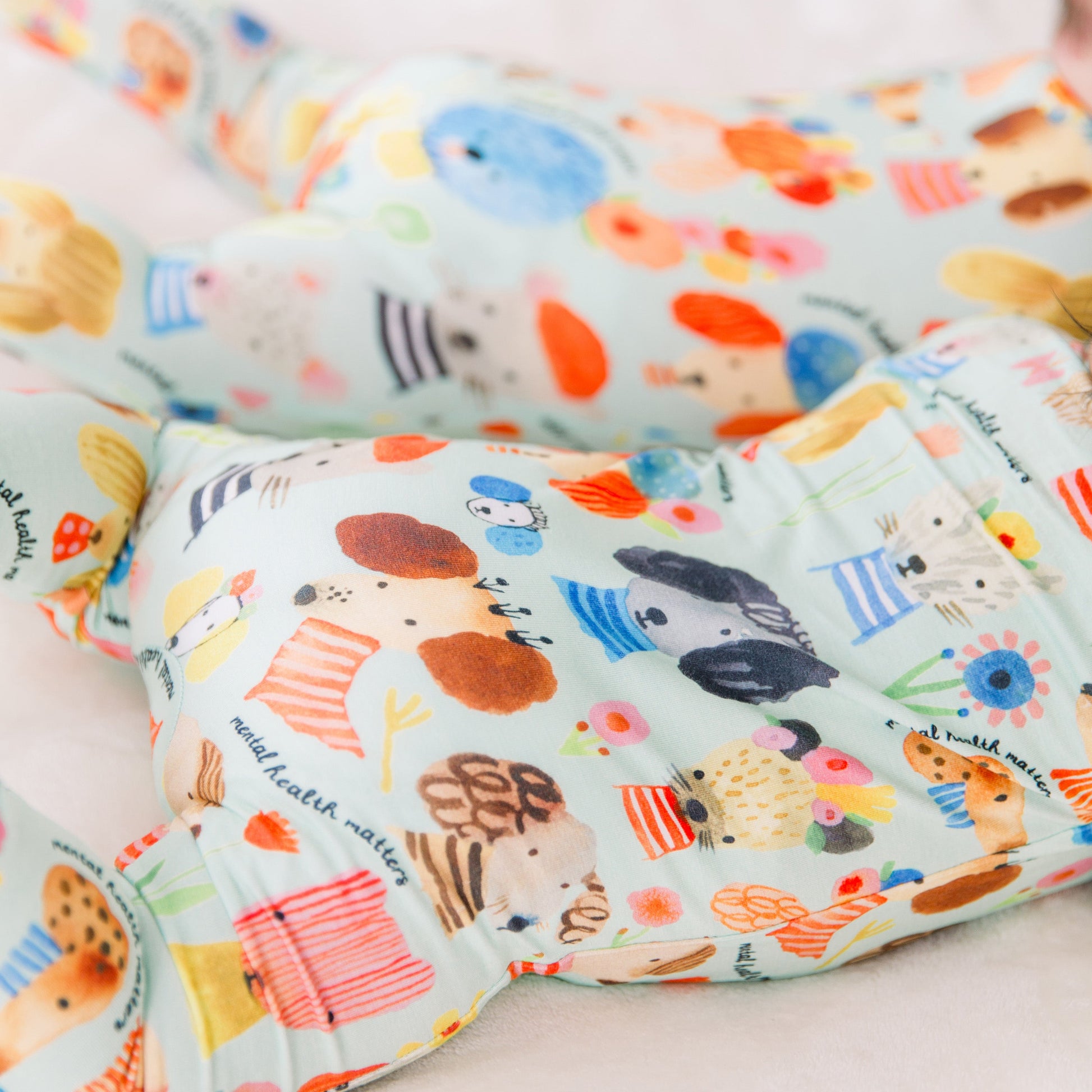 Mindful Doggos | Bamboo Footie Onesie Sleeper | "Mental Health Matters" | Thermo-Regulating, Double Zipper, 4-Way Stretch