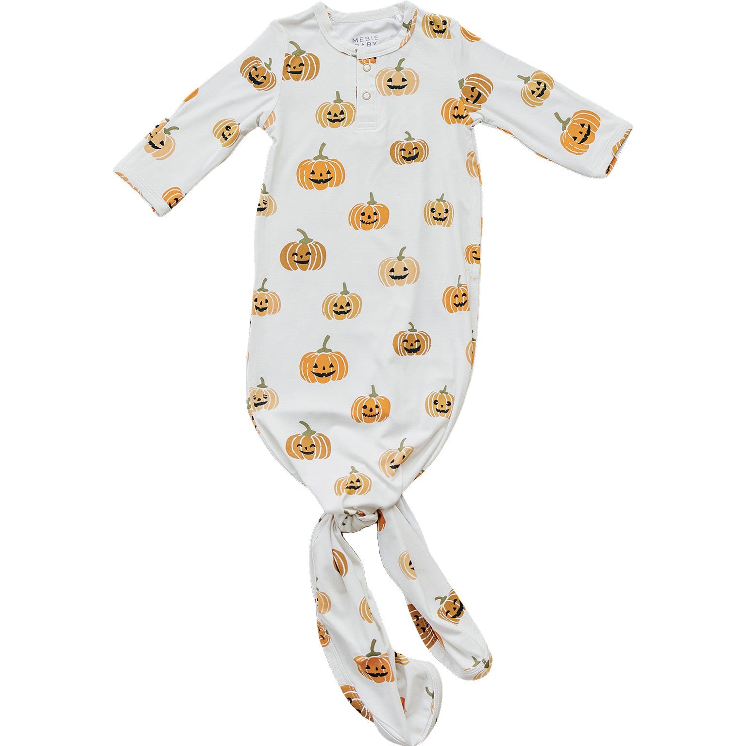 These gowns are size 0-3. We love these Halloween Themed Gowns. They are made out of supremely soft Bamboo Rayon to keep your little one comfortable. We have a variety of gender neutral designs and colors making them perfect for any baby. They have fold over hands and two snaps for easy on and off. We also have shoulder flaps to make it easily pull over your little ones head, we want to make dressing your baby as easy as possible. The bottom is easily tied and untied in a knot for no-fuss diaper changes which makes it a newborn baby essential! These are made out of the same fabric as our stretch swaddles and match the colors of the stretch swaddles, head wraps, and hats.Â