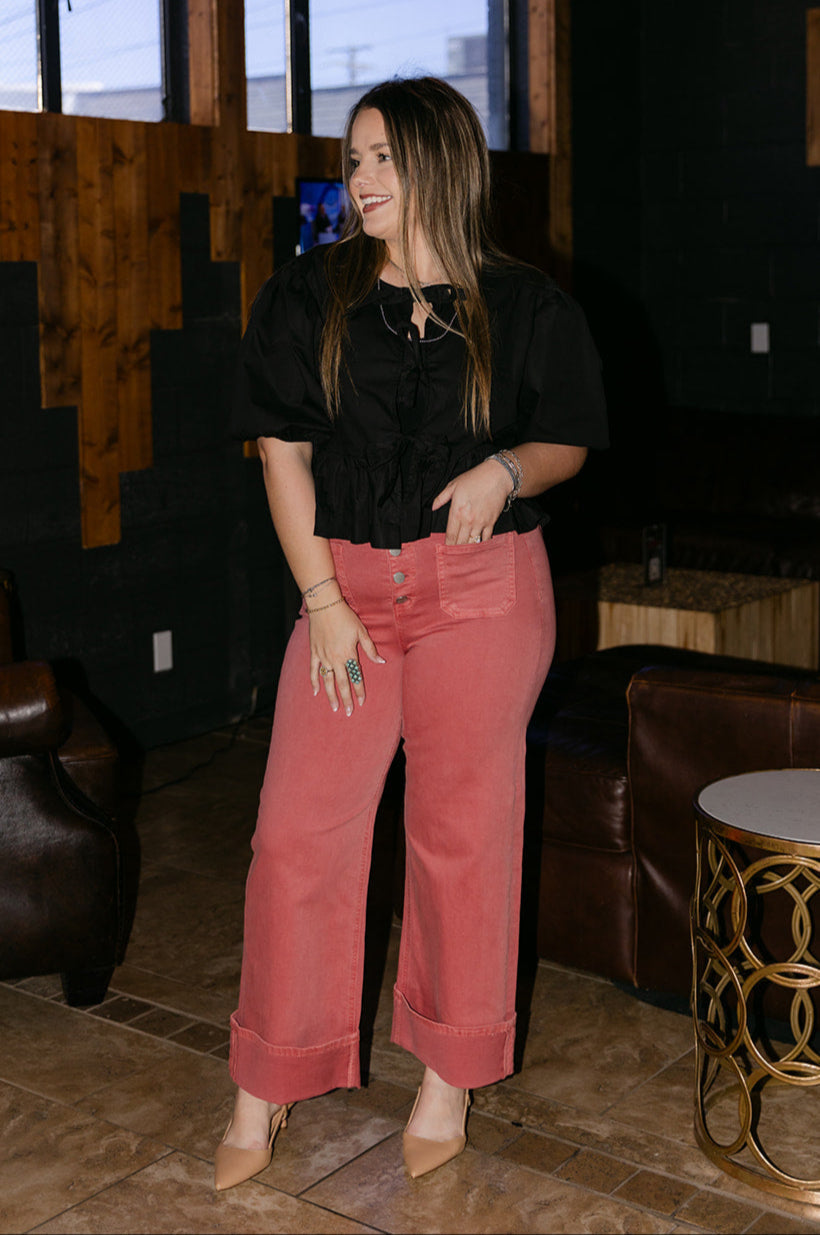 Non-distressed denim that can be styled any way you want. These high-rise, wide-leg jeans feature a button-fly and front patch pockets. High rise wide leg, front patch pocket cuffed pants that can be un-cuffed for length.