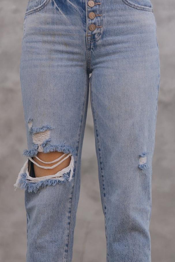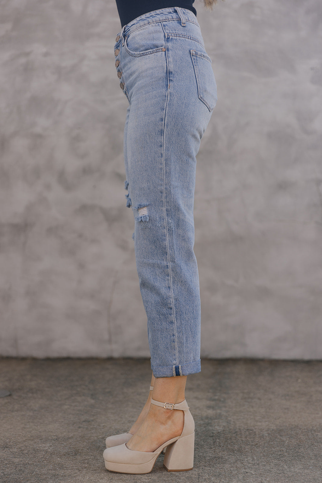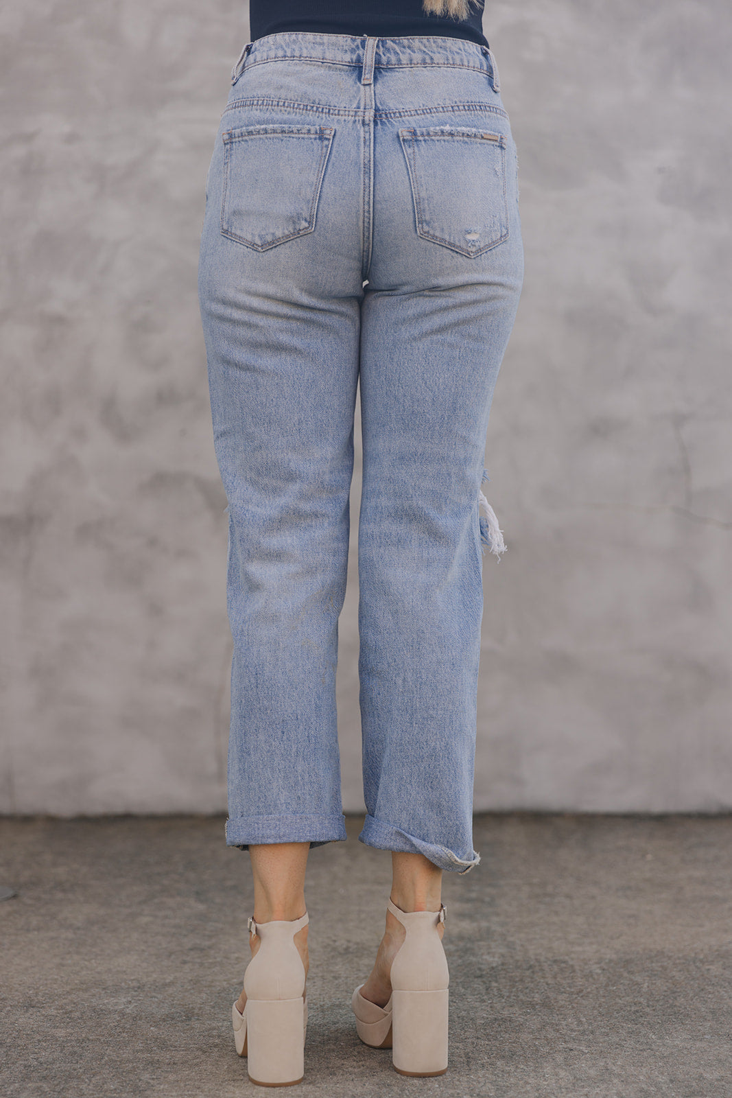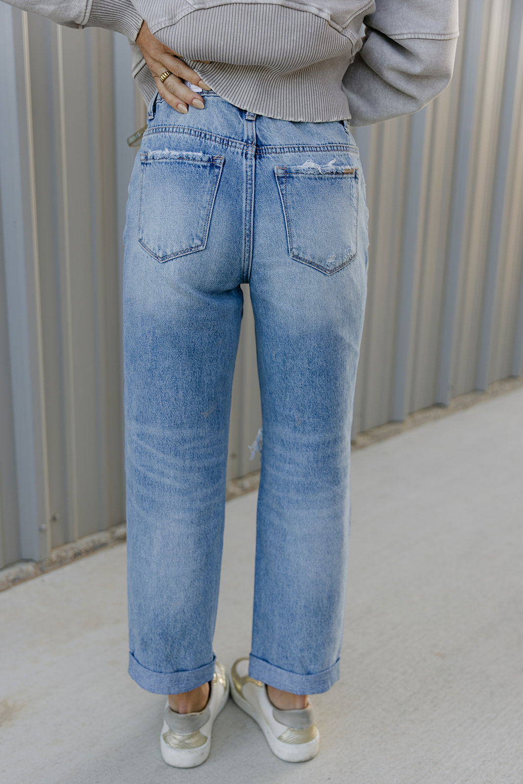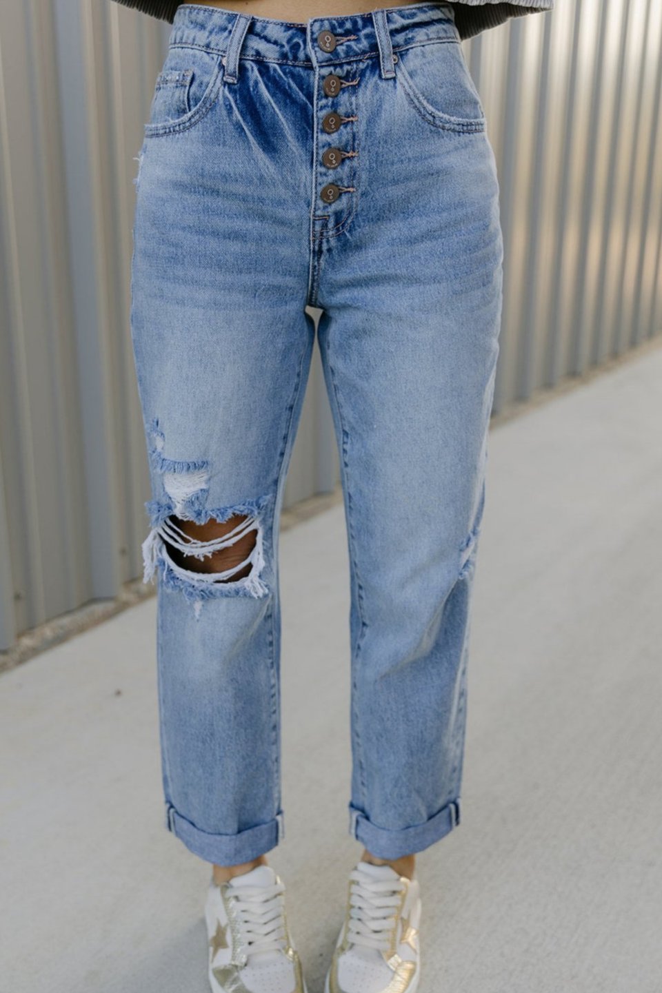 High-rise boyfriend jean featuring a distressed look and rolled hems