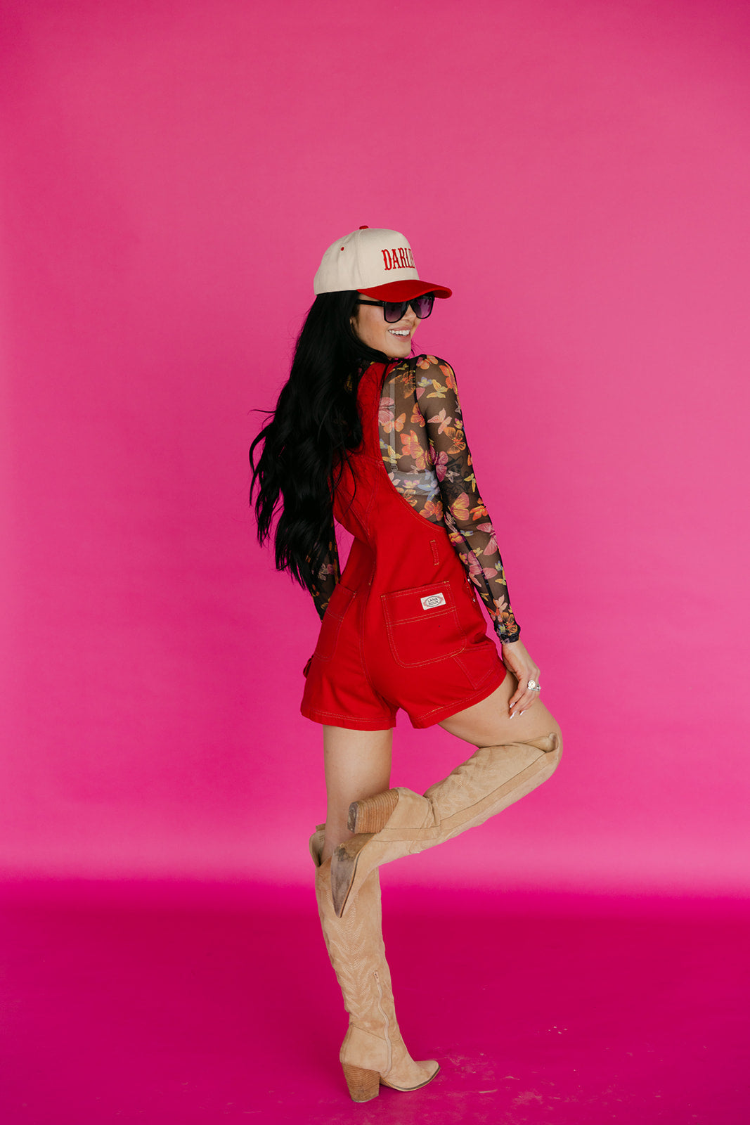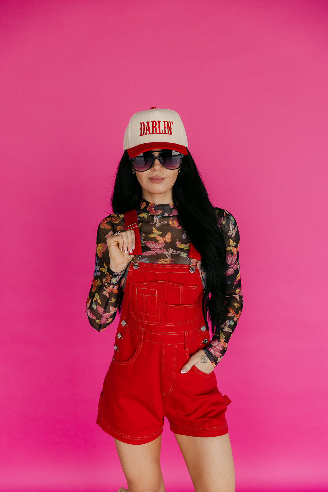 This semi-sheer, long-sleeve top features a mock neck with a vibrant butterfly print and is perfect for layering.