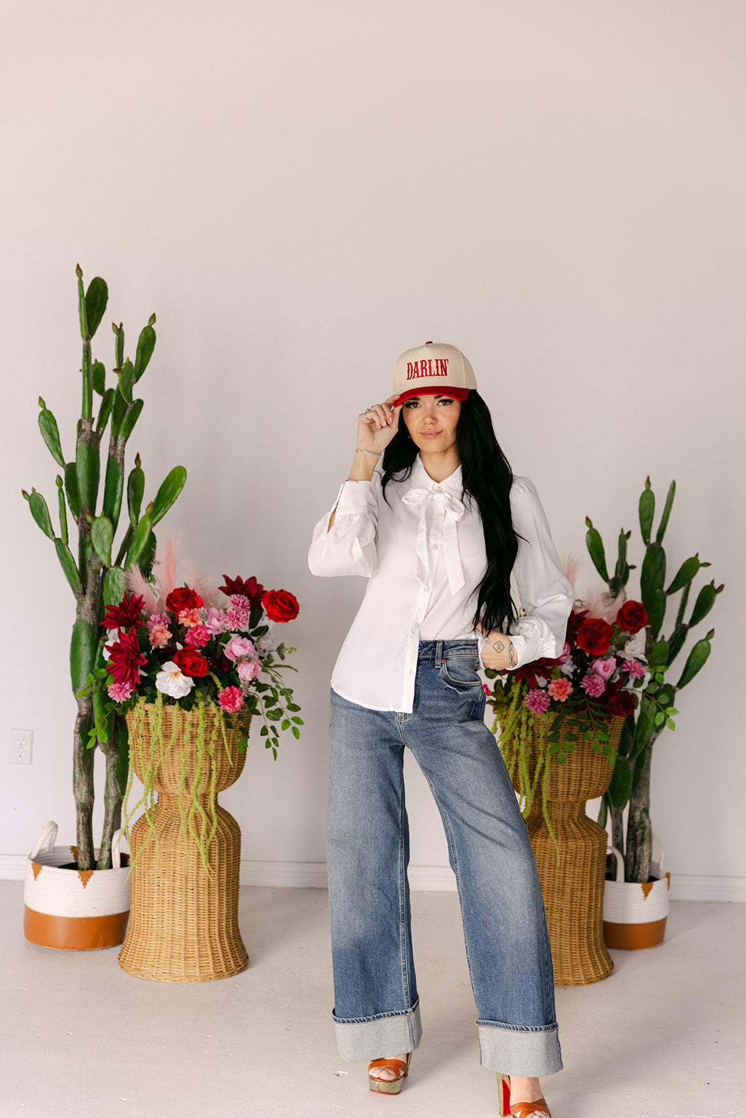 This blouse is a classic silhouette and style with the cutest pearl button accents. Also featuring a removable neck-tie, this is perfect to bring some classy western vibes into the office or to date night.