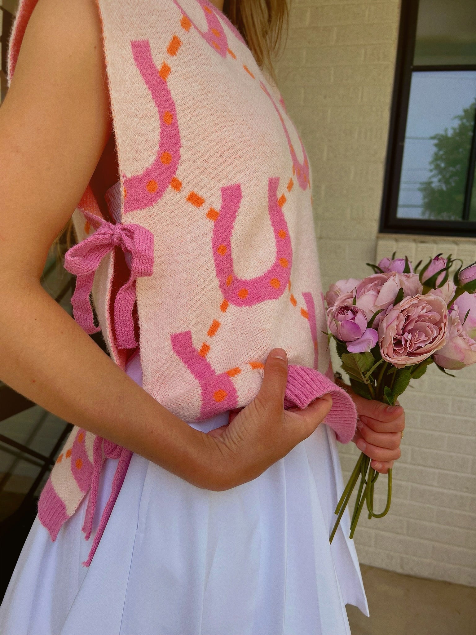 A lucky layer with a feminine twist. This sweater vest features a subtle horseshoe pattern and a charming side-bow detail for a touch of softness. Perfect for layering through the seasons—playful, polished, and full of character.