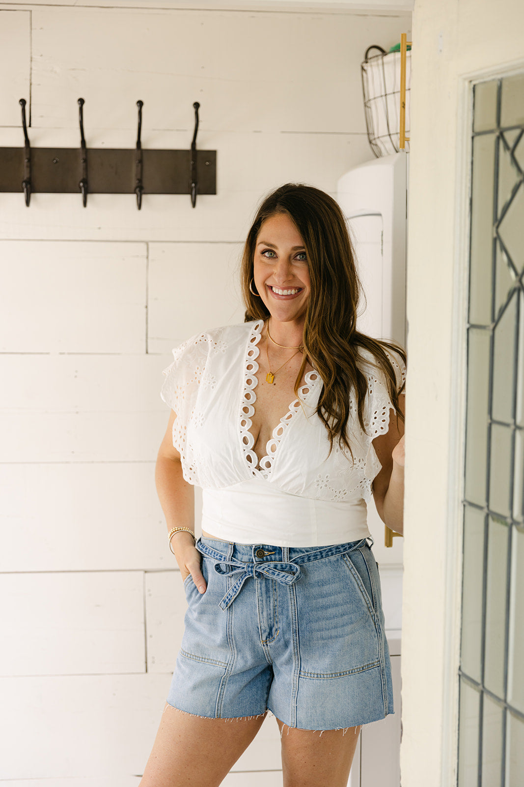 Softly refined with a bridal touch. This short sleeve V-neck top features delicate trim detailing that adds just the right amount of elegance. Lightweight and effortlessly polished—perfect for bridal, celebrations, or any events that call for something simple and special.