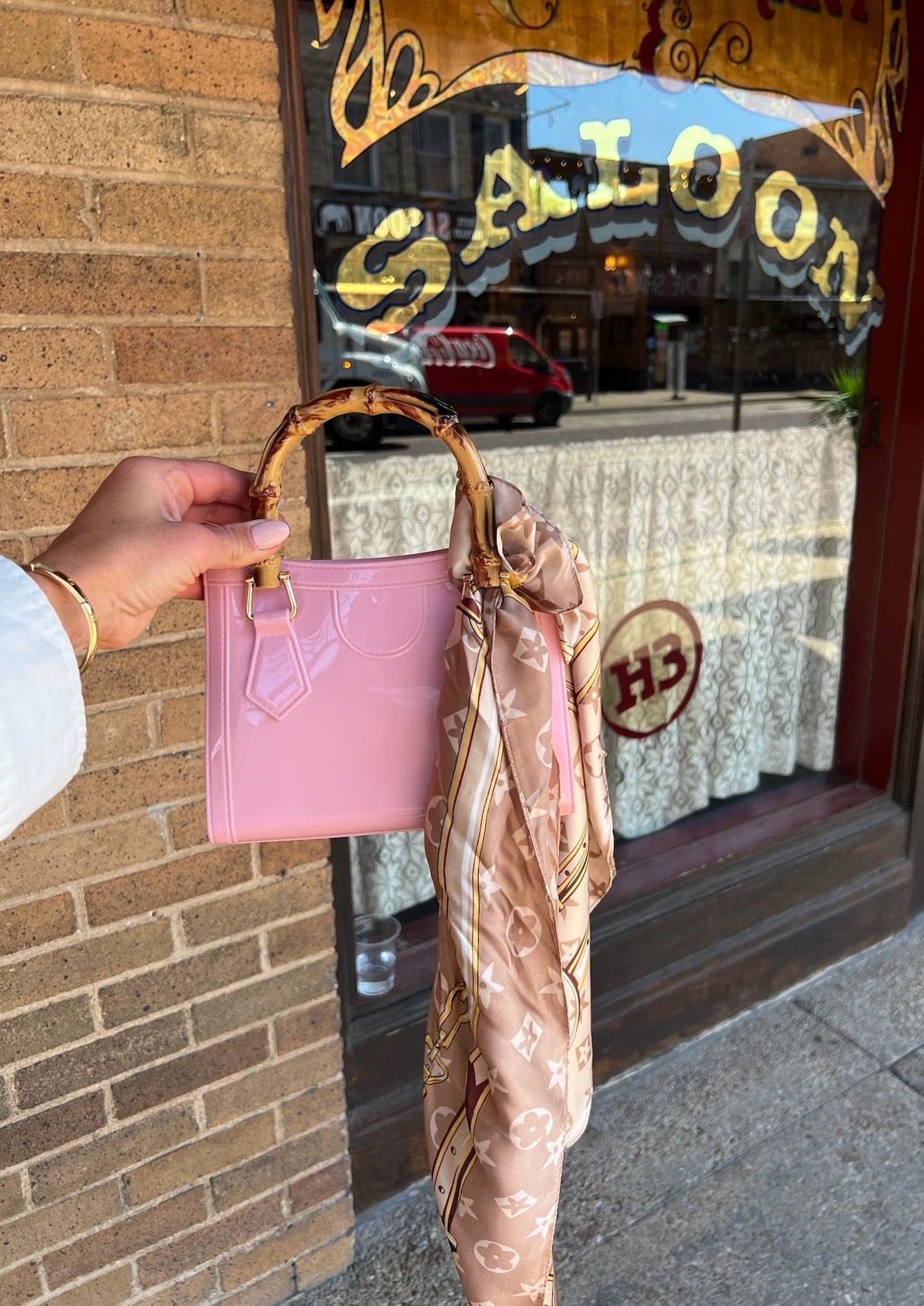 With its structured square shape, glossy jelly finish, and luxe bamboo handle, this bag is the perfect blend of retro charm and modern edge. Dress it up or down—it’s made to turn heads wherever you take it.