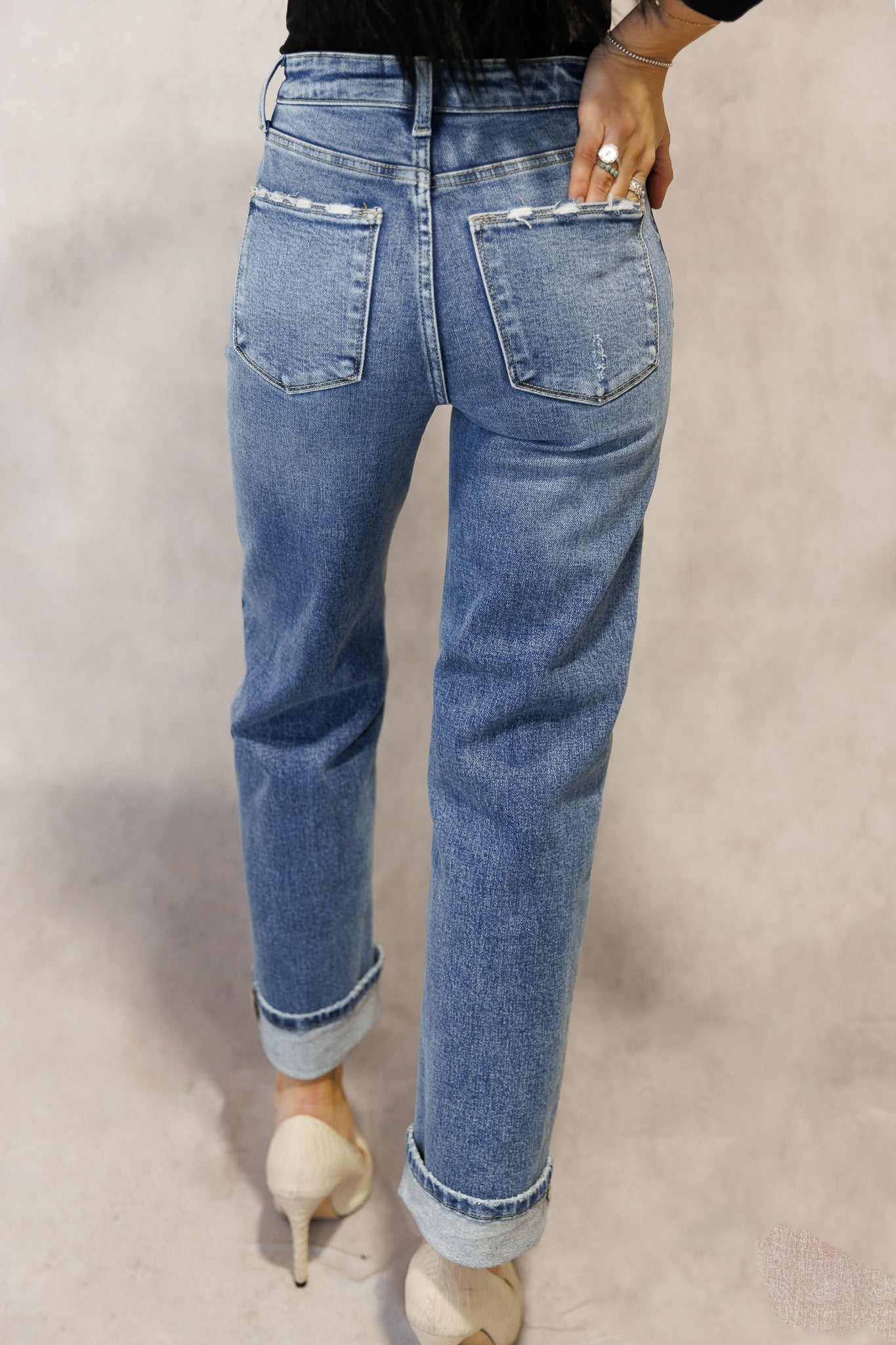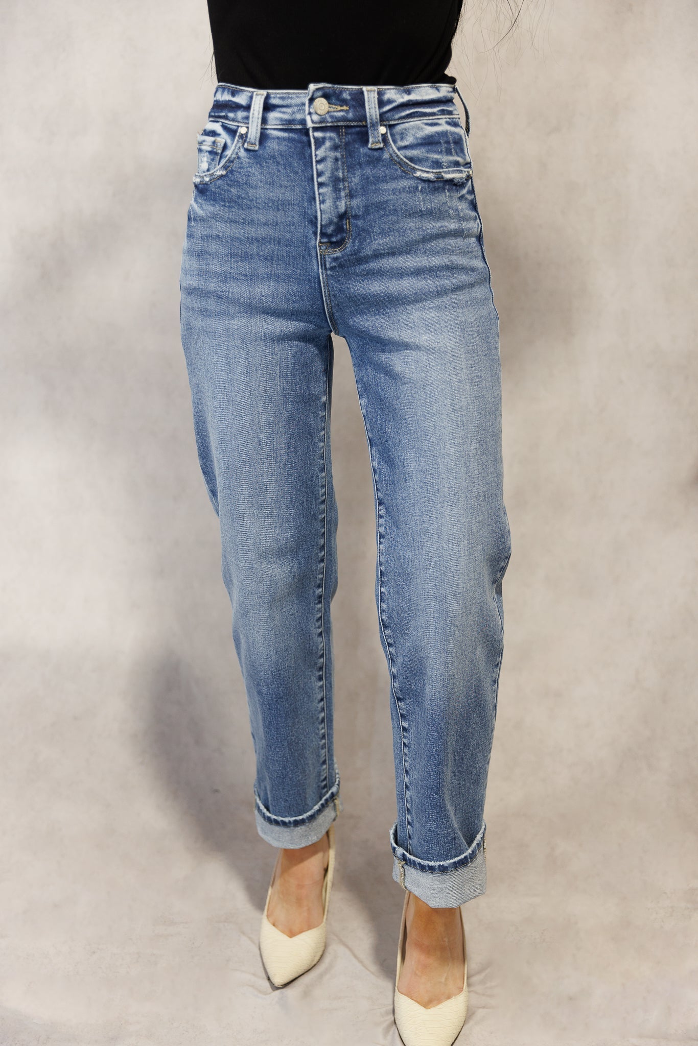 High rise stretch relaxed straight leg jean featuring a cuffed hem. Perfect for work or school since there is no distressing.