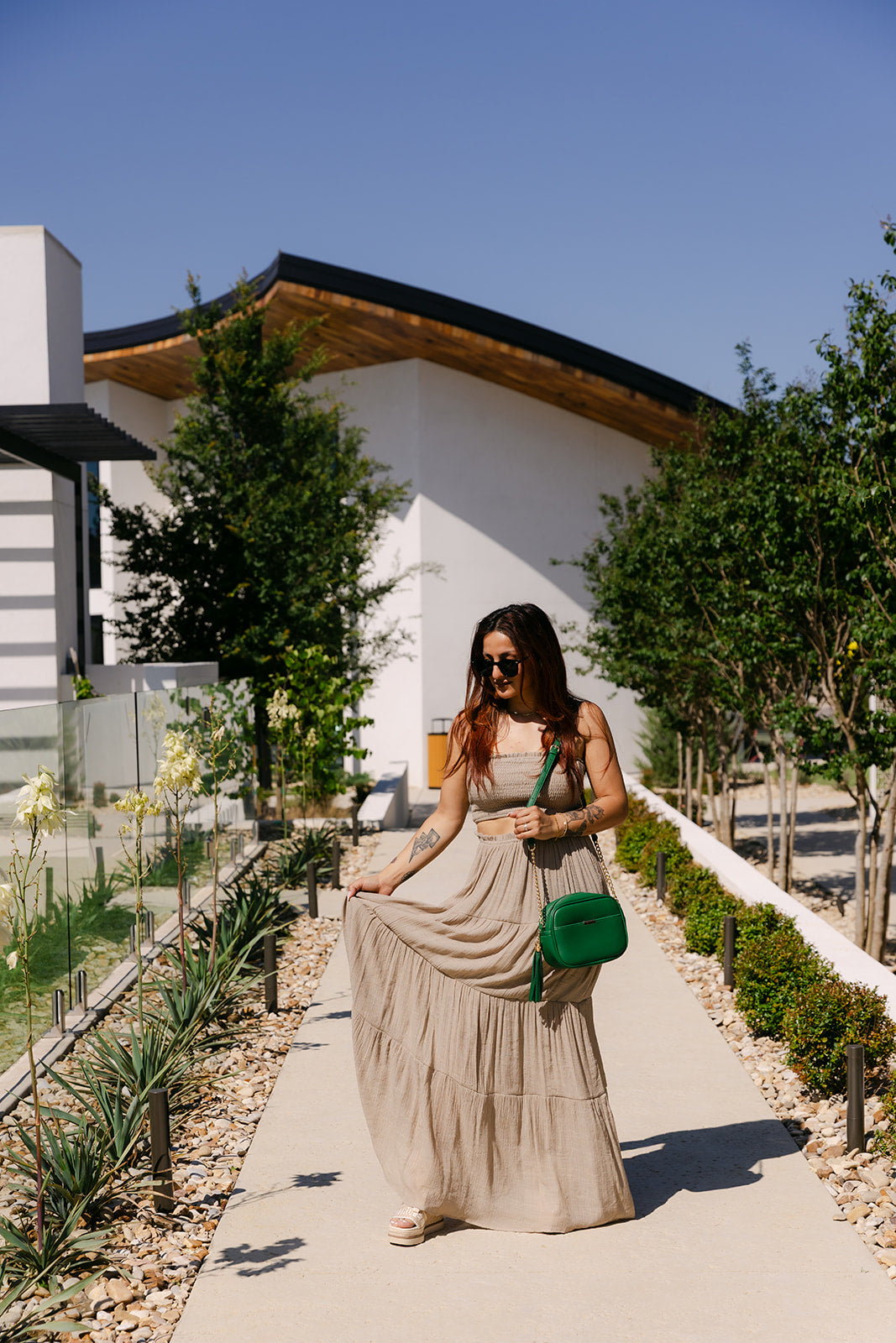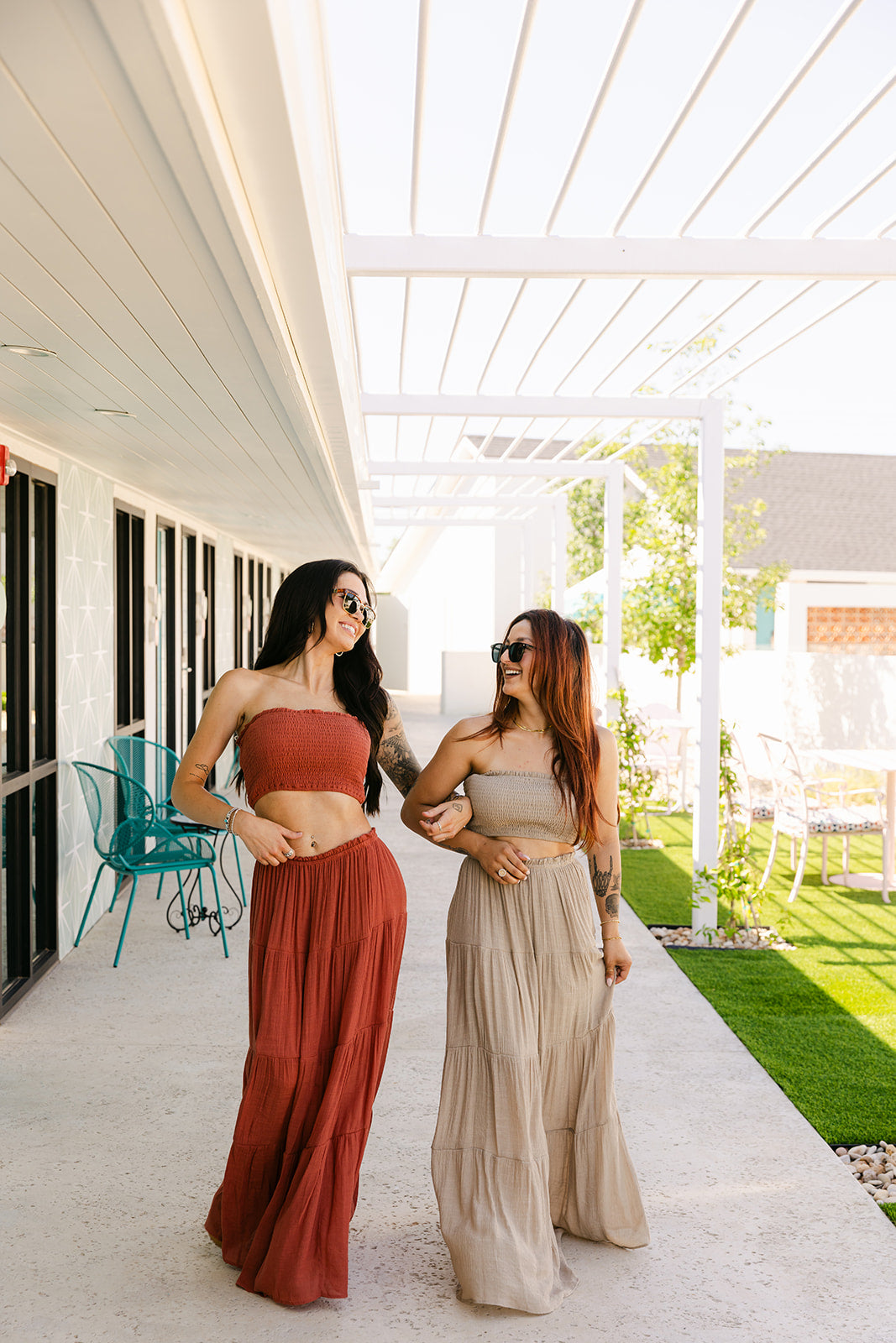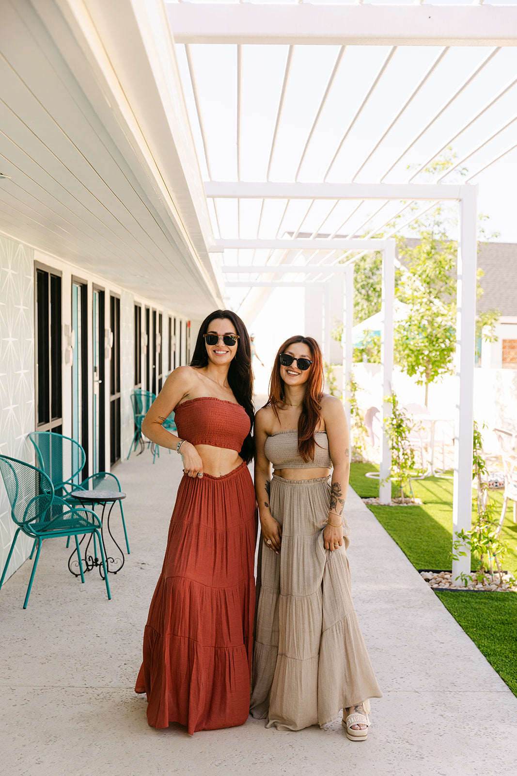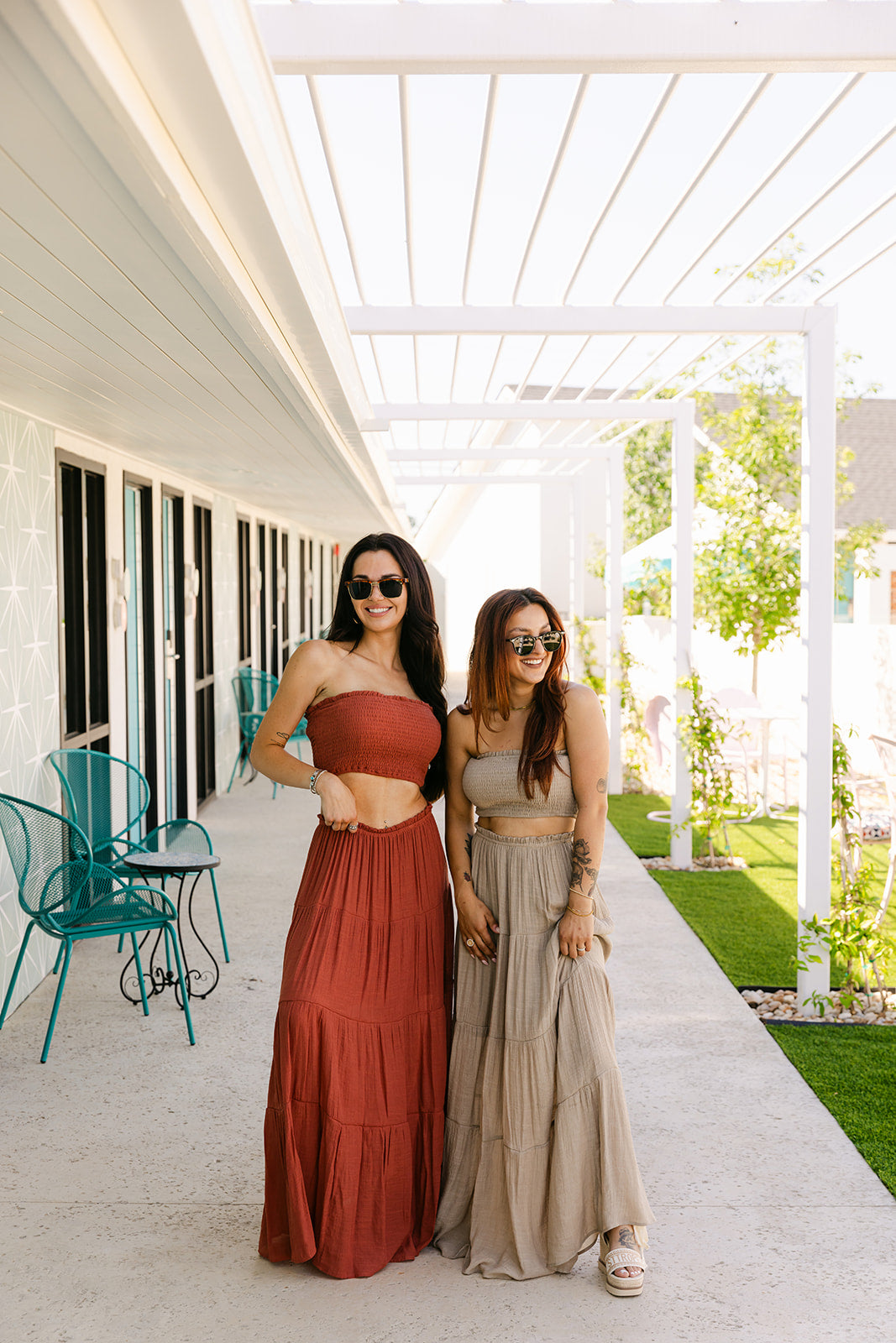 This matching set features a strapless smocked crop top paired with a high-rise maxi skirt. Gathered detailing and tiered layers add soft movement, making it an easy favorite that is comfortable + perfect for any occasion.