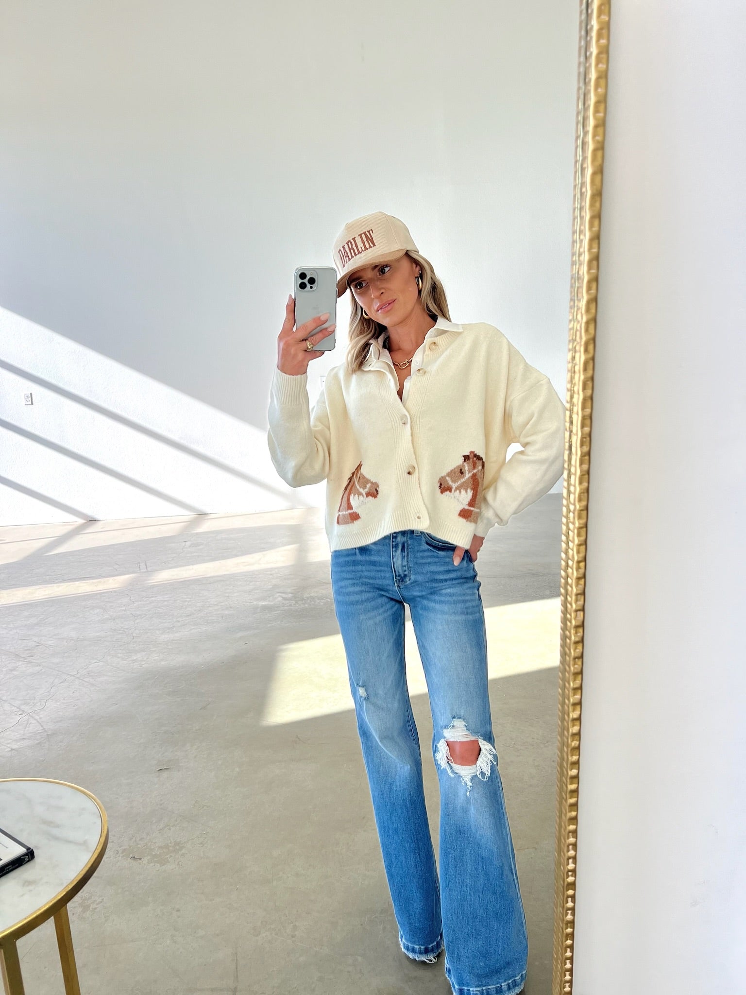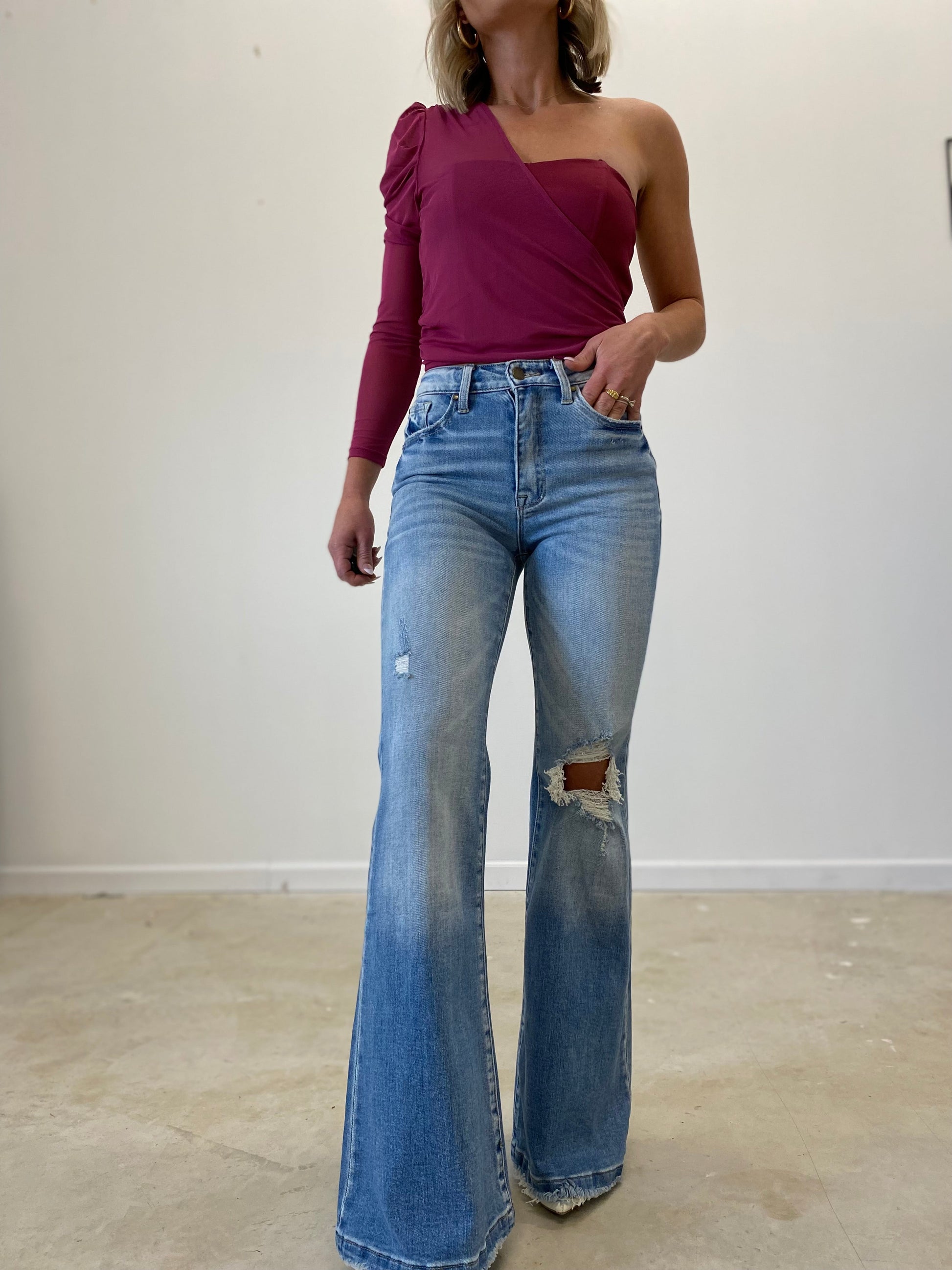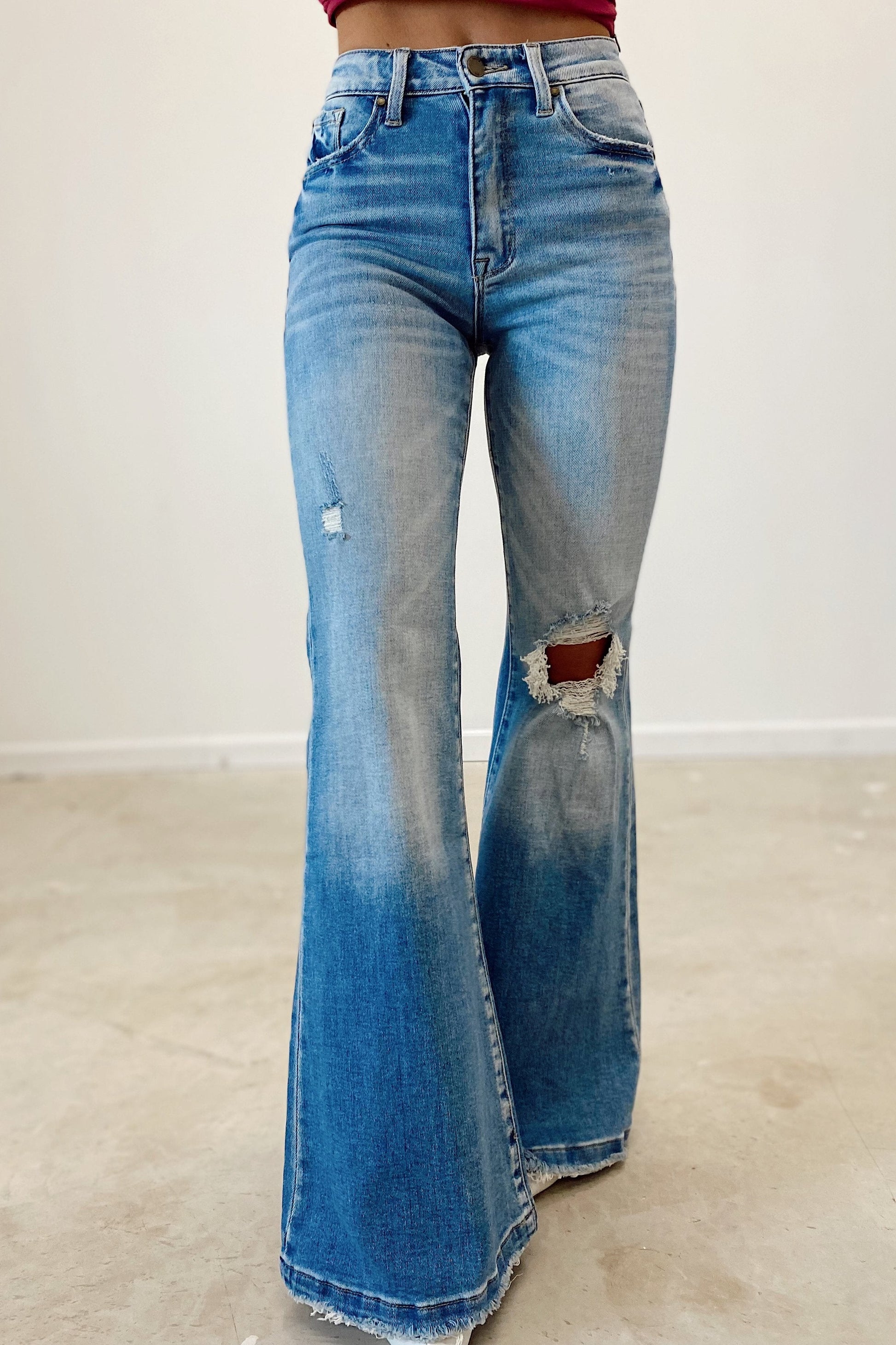 These super high-rise flare jeans are inspired by classic ‘70s silhouettes, featuring a flattering wide leg, knee distressing, and a 34" inseam. Finished with a button closure, zip fly, and 5-pocket styling—perfect for elevating your everyday denim lineup. Not to mention, they have a GREAT stretch.