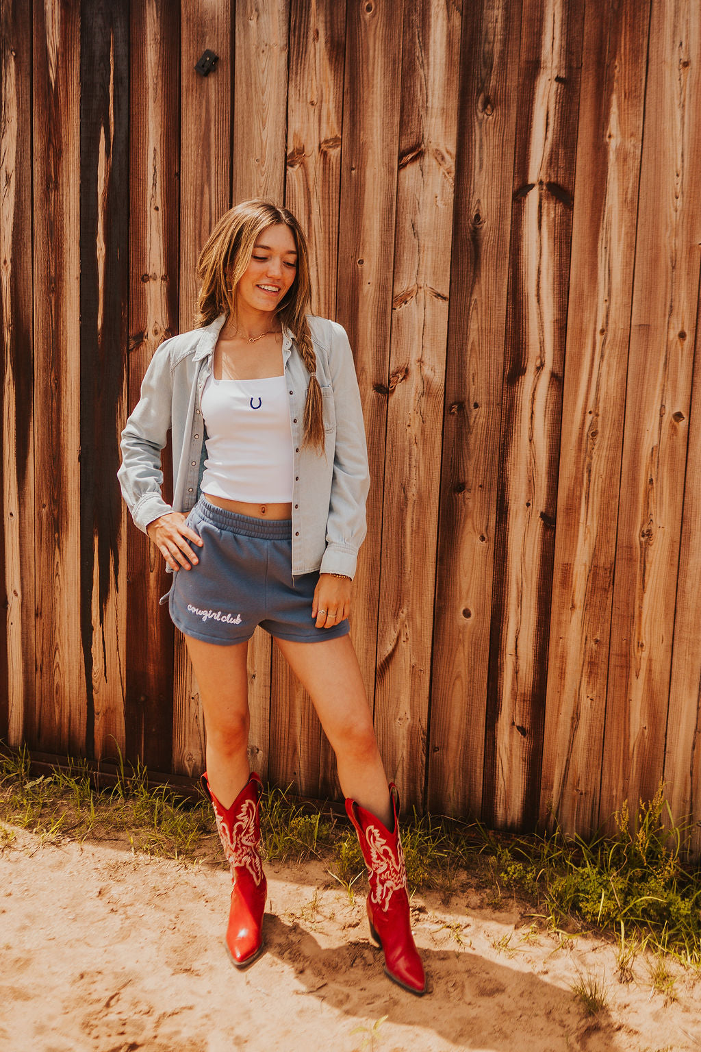A staple made better--This white tank keeps it classic with a fitted silhouette and soft stretch feel, finished with a small black embroidered horseshoe at the front for a subtle western touch.