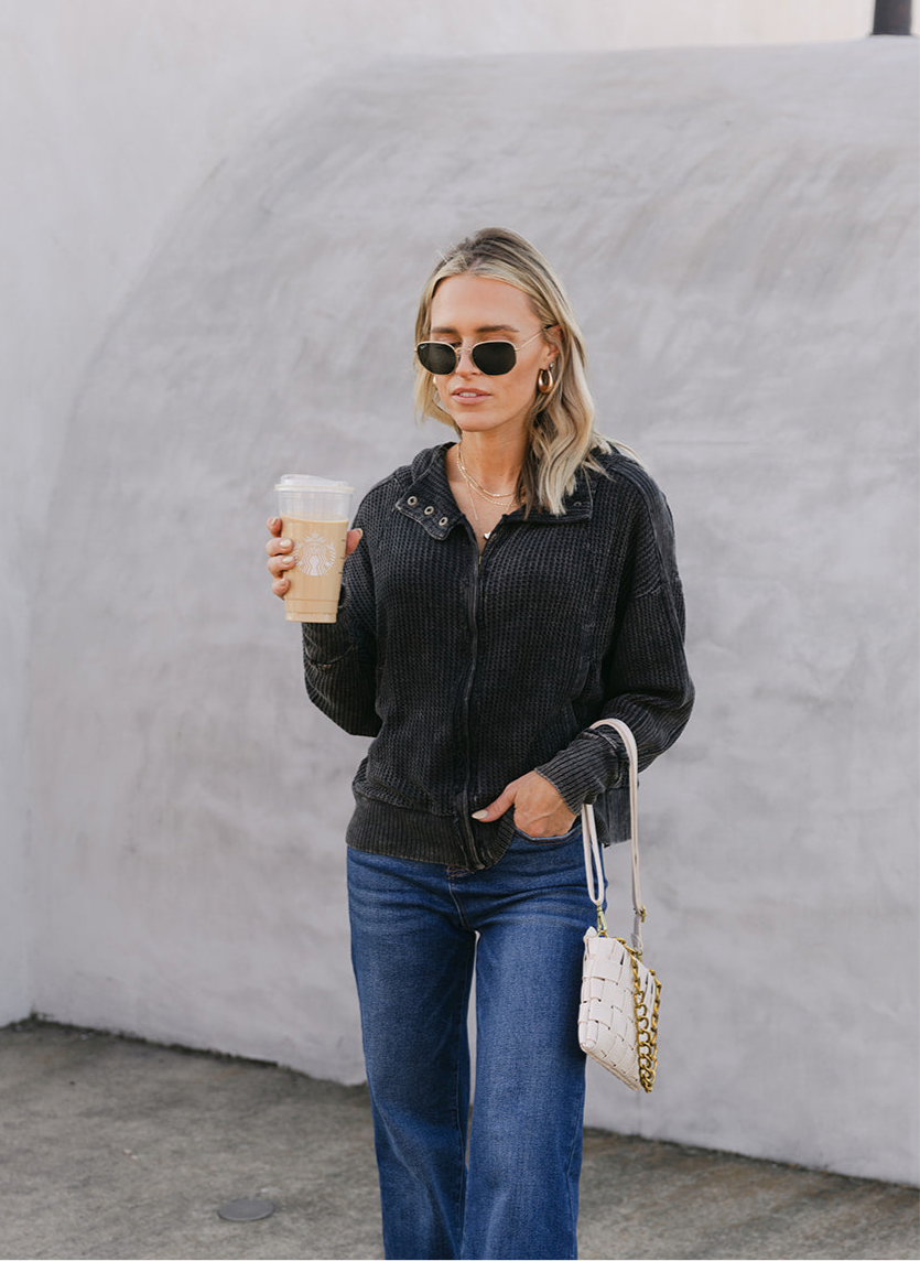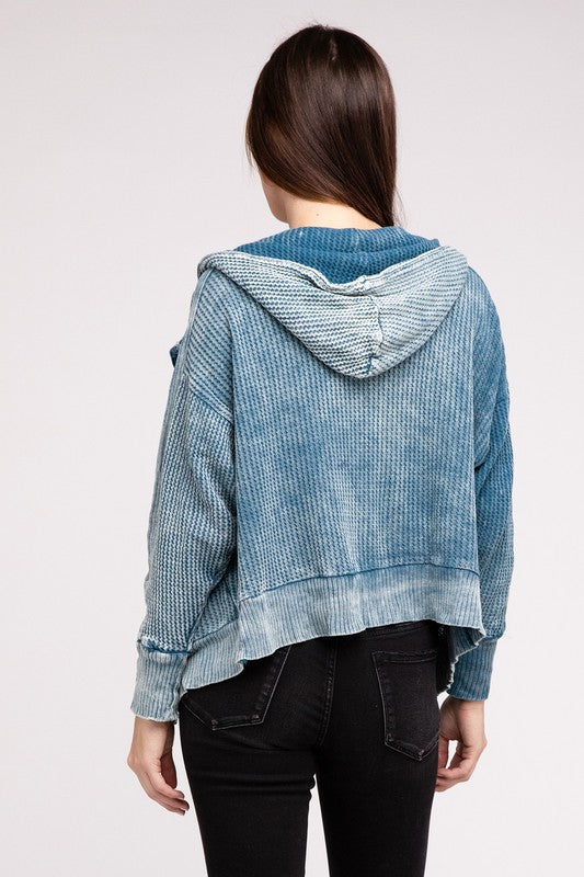 Introducing our Acid Wash Cotton Waffle Hooded Zip-Up Jacket, a versatile and stylish addition to your wardrobe. This jacket exudes a laid-back yet trendy vibe. The slouchy hood adds a relaxed touch, while the hidden zip-up and three-snap button closure provide a sleek and secure fit. With practicality in mind, this jacket features pockets for added convenience.