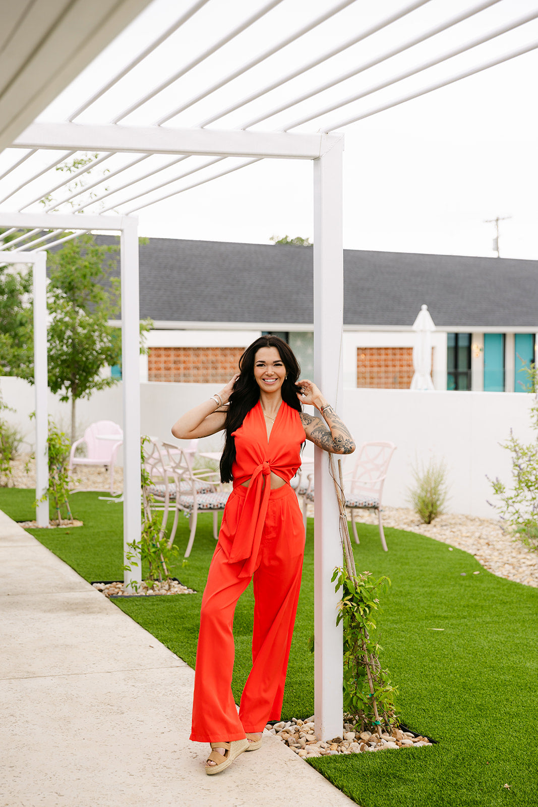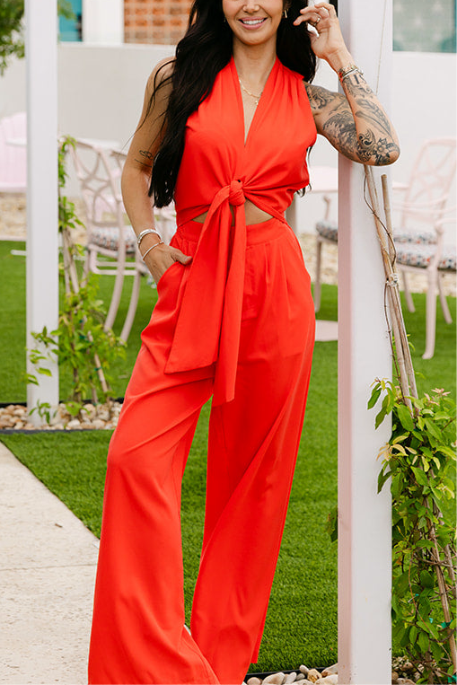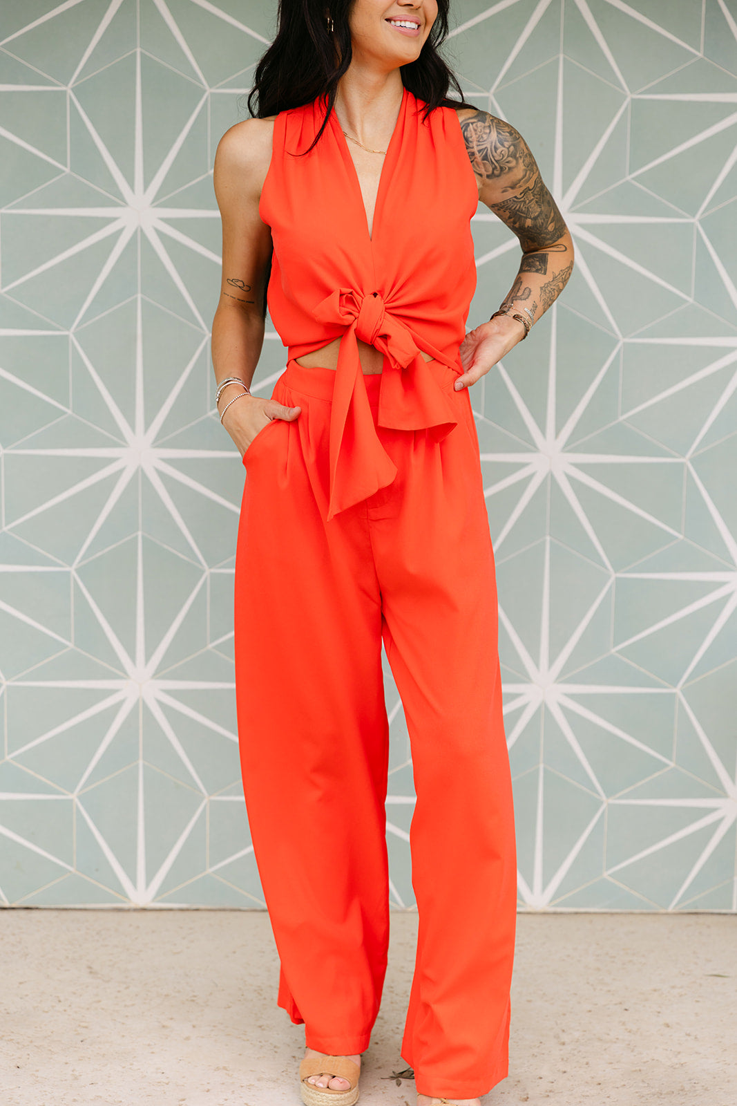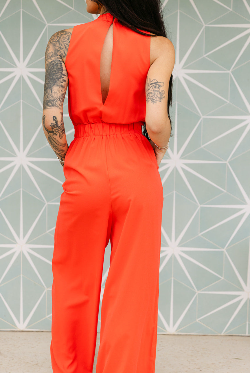 This sleeveless jumpsuit is designed with a flattering front tie detail, side pockets, and a hidden back zipper for a smooth, tailored fit. Whether you're dressing it up with heels or keeping it casual with sandals, this piece is the perfect blend of comfort, style, and a pop of color.