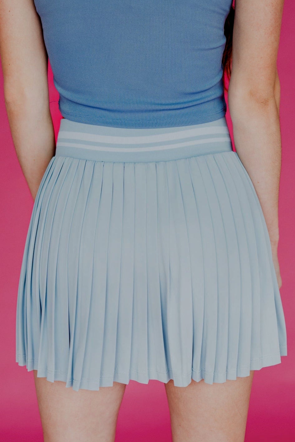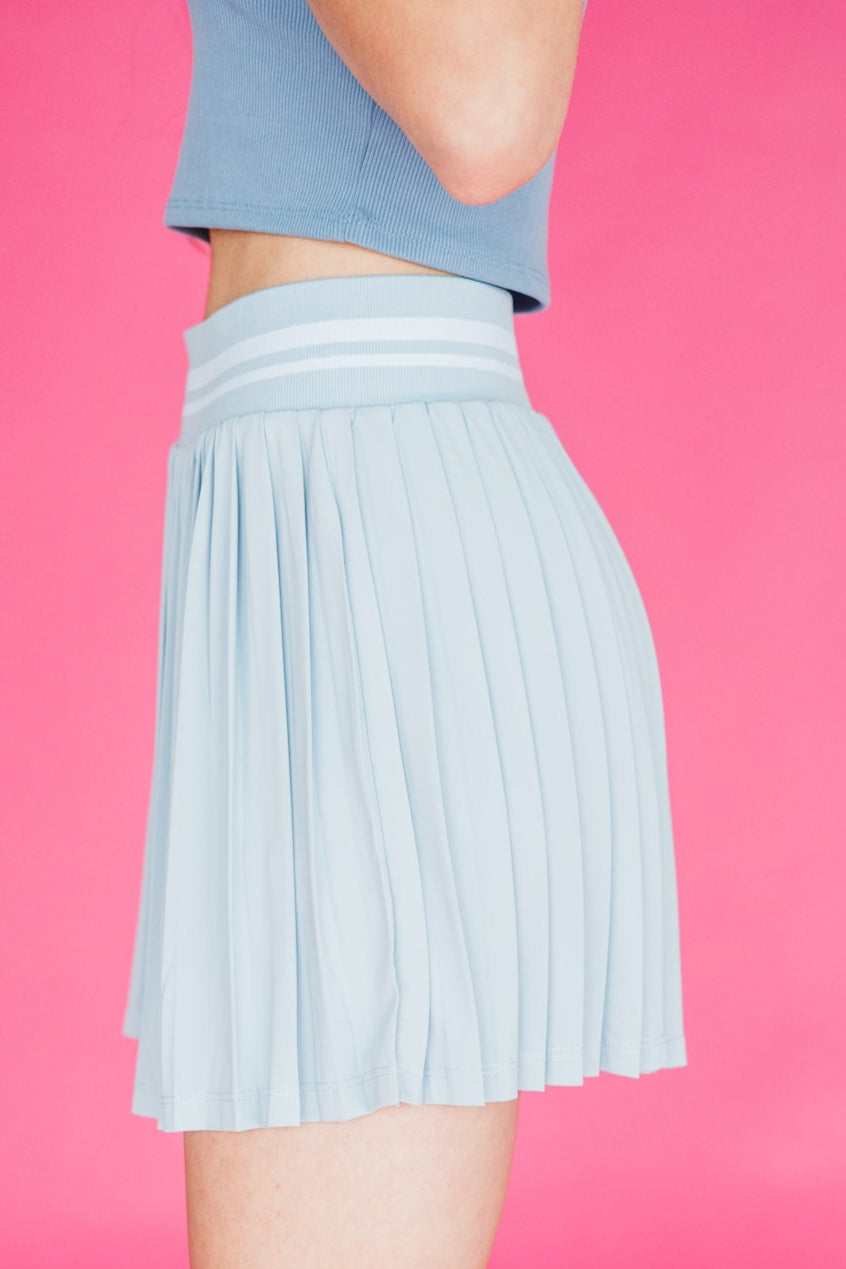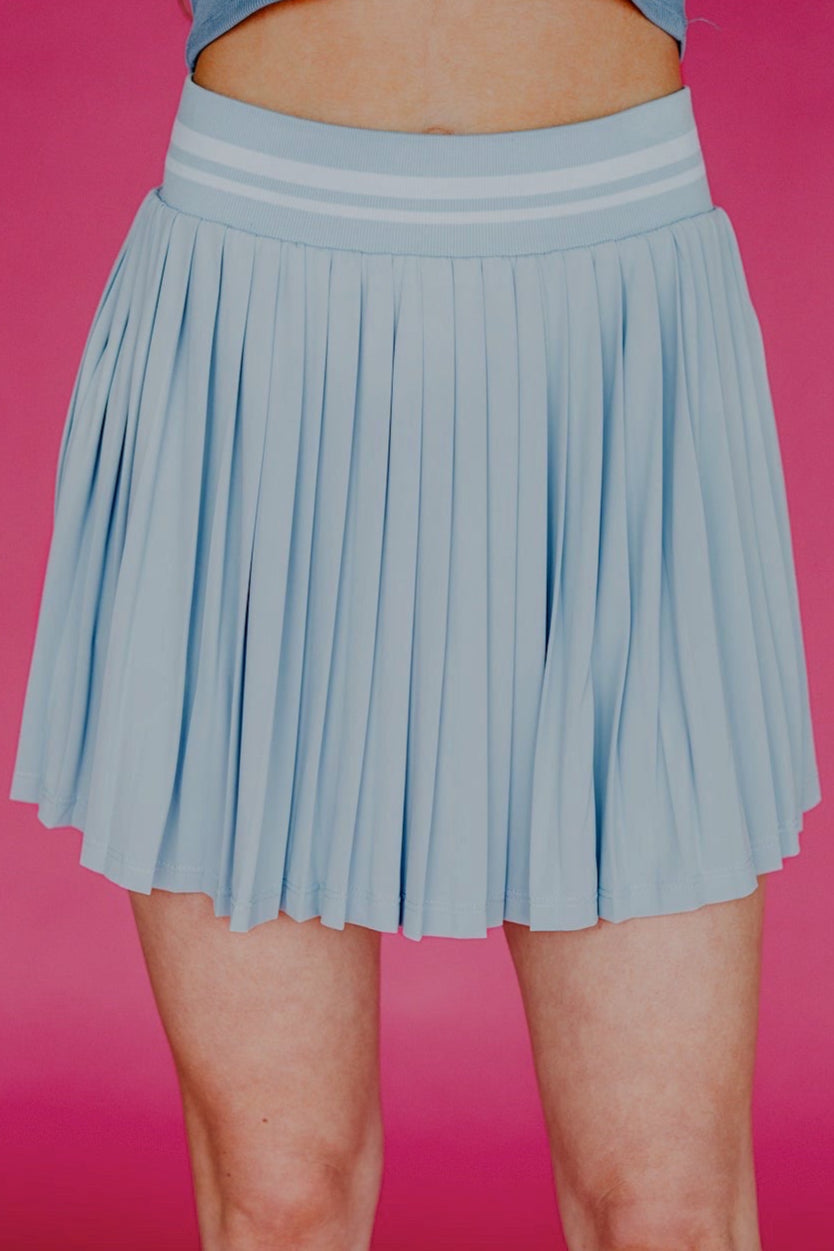 This mini skirt features a blend of tennis-inspired details and retro elements. The horizontal two-tone strip trim waistband reveal an iconic yet contemporary vibe while pleating adds volume and movement to the skirt.