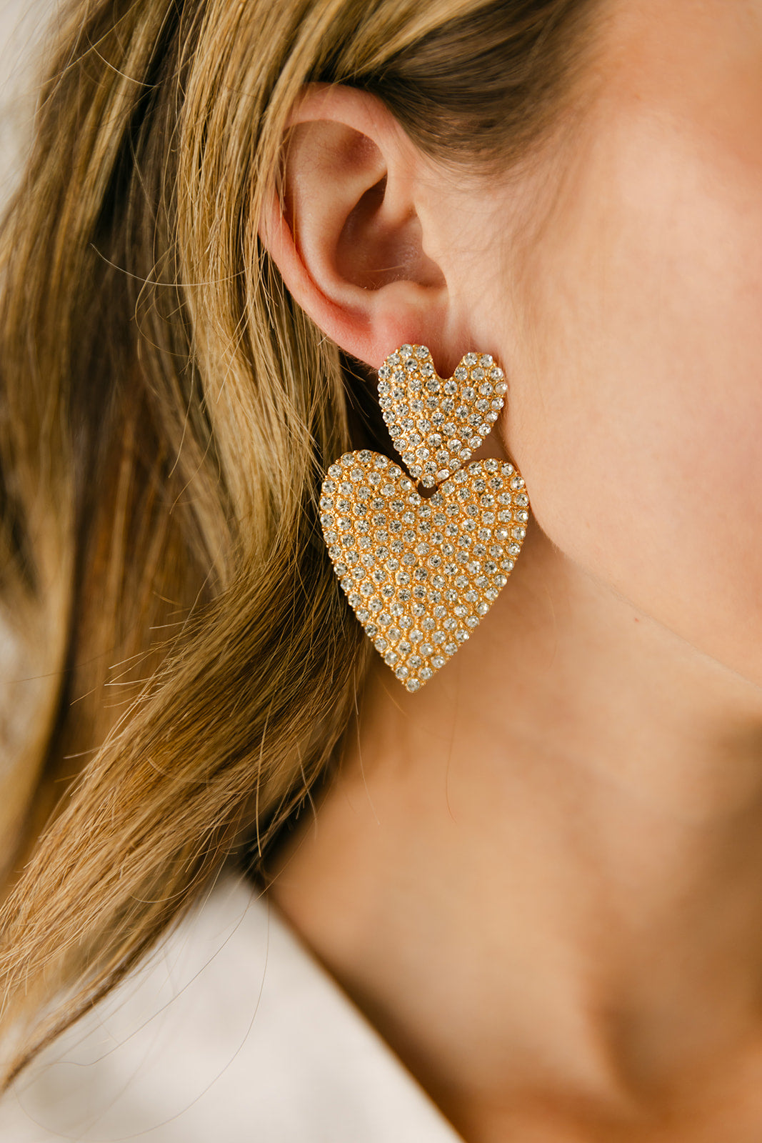 The most stunning pair of heart-shaped earrings adorned with sparkling rhinestones. Perfect for adding touch of elegance to any outfit for any occasion.