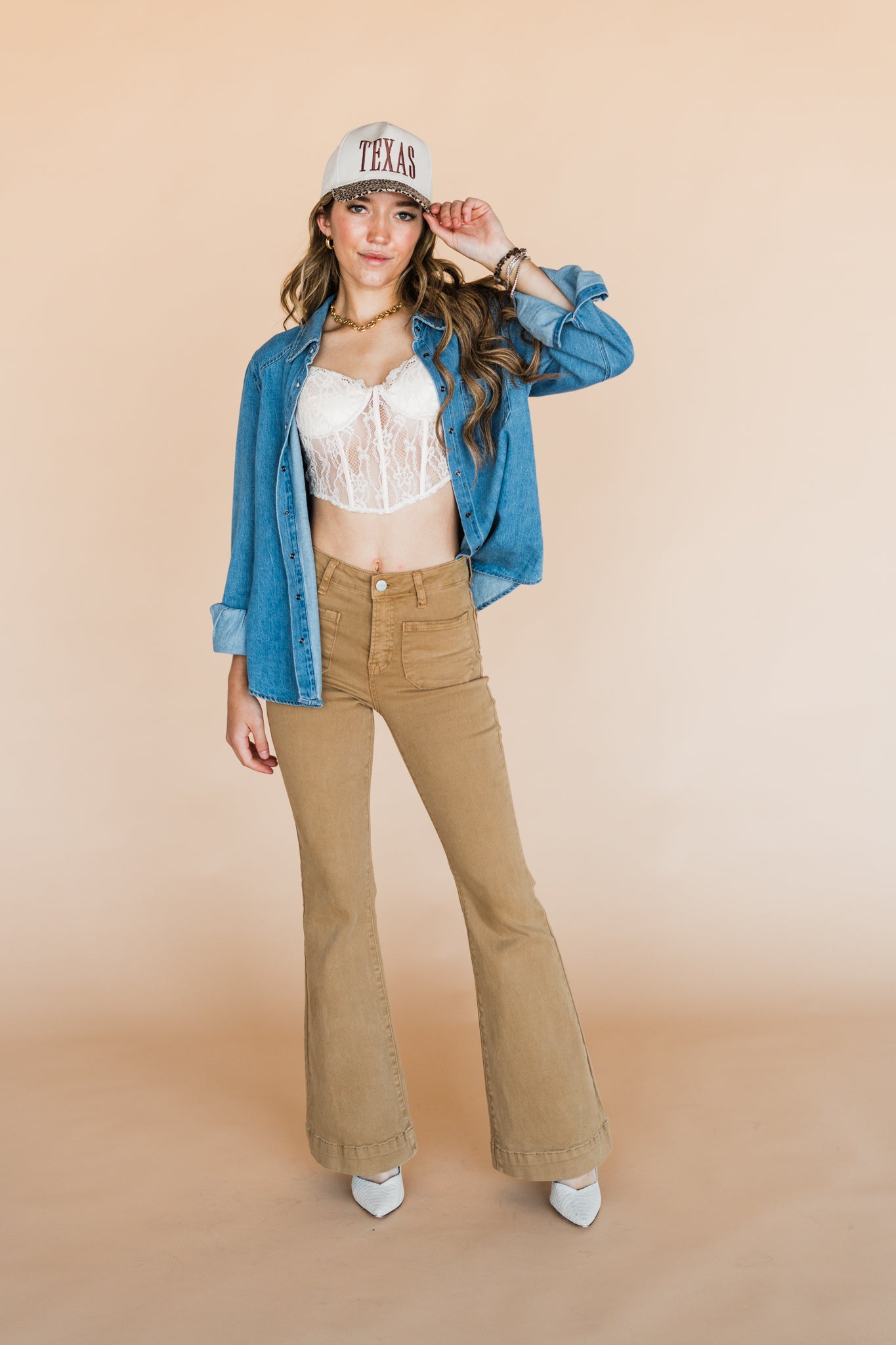 Bringing back bell-bottom style trousers. These high-rise, bell-bottom style pants feature a front patch pocket and flattering silhouette with just the right amount of stretch.