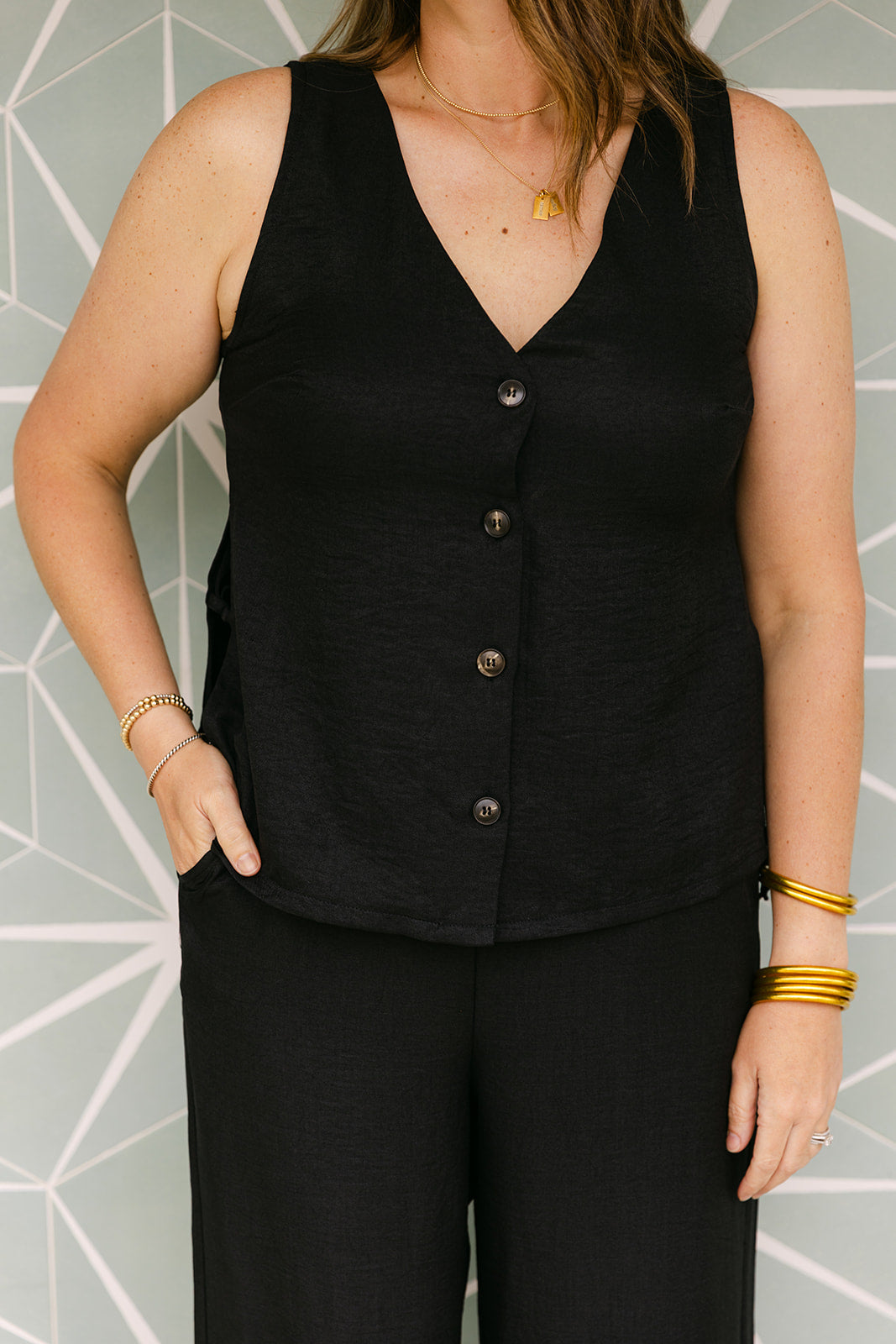 Chic and breathable, this linen set features a sleeveless V-neck top with a button-down front and side ties, paired with high-waisted wide-leg pants. Lightweight and effortless—perfect for warm days and easy styling.