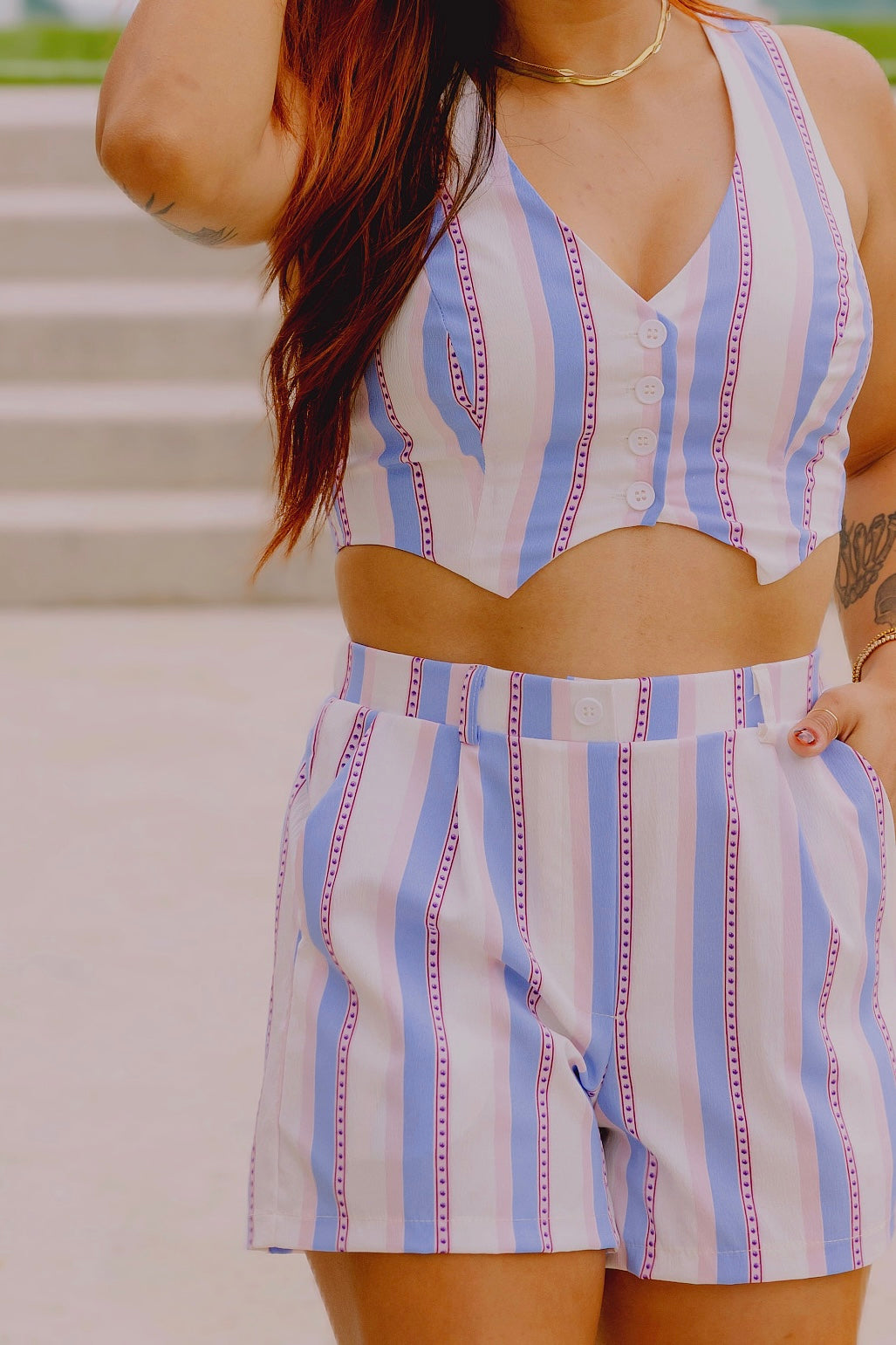 A bold take on effortless dressing. This low neckline vest features a flirty fit with bow tie closure in the back, paired with tailored pleated shorts for an easy, elevated fit.
