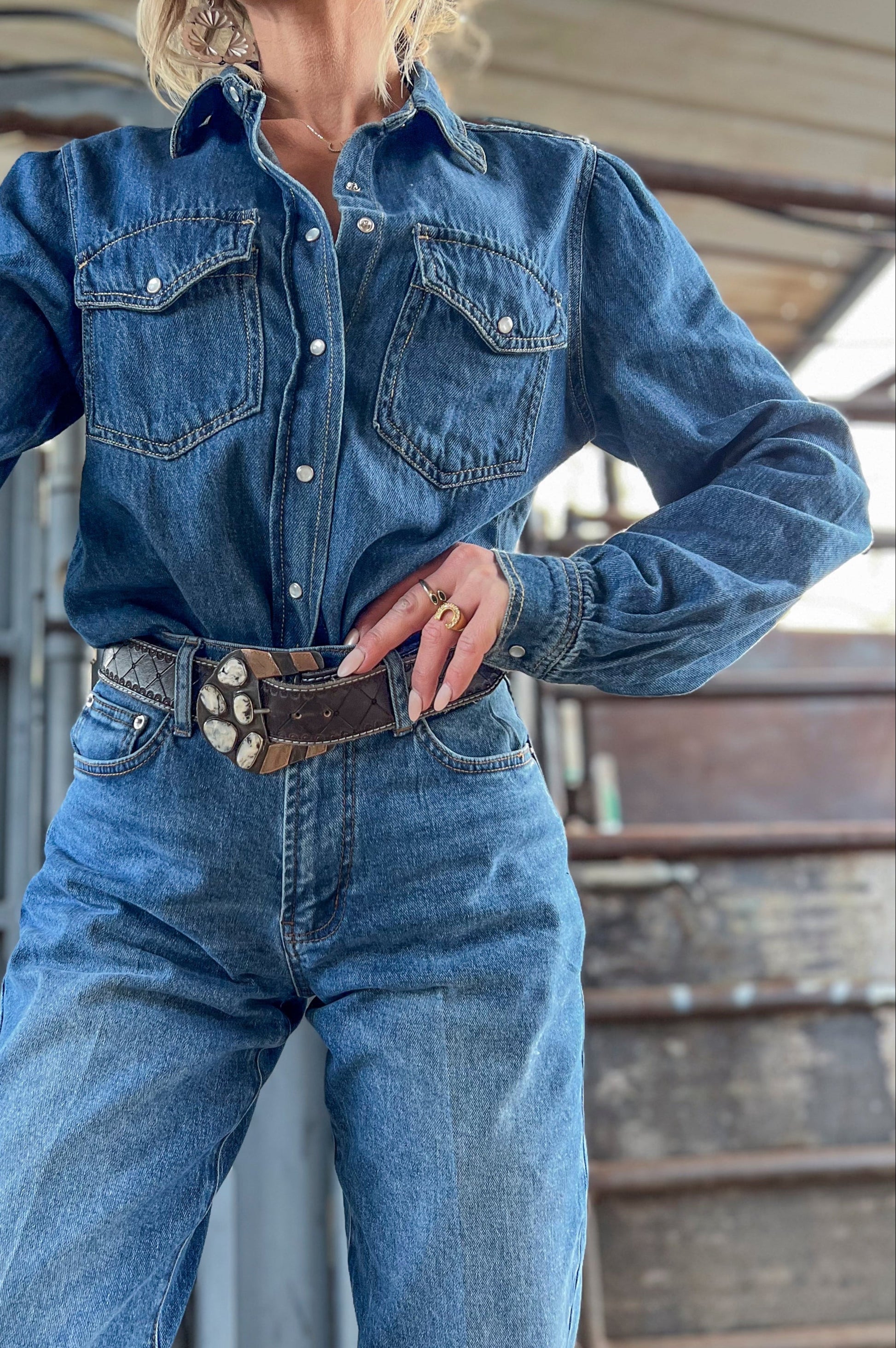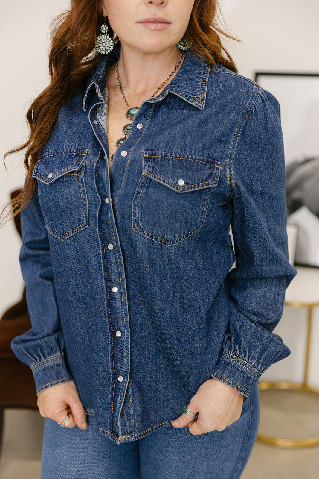 We're here for a denim top, and this one is a favorite of ours. This high-quality, heavy-weight denim top features sleeve shirring detail, pearl snaps, and is a semi-relaxed fit.