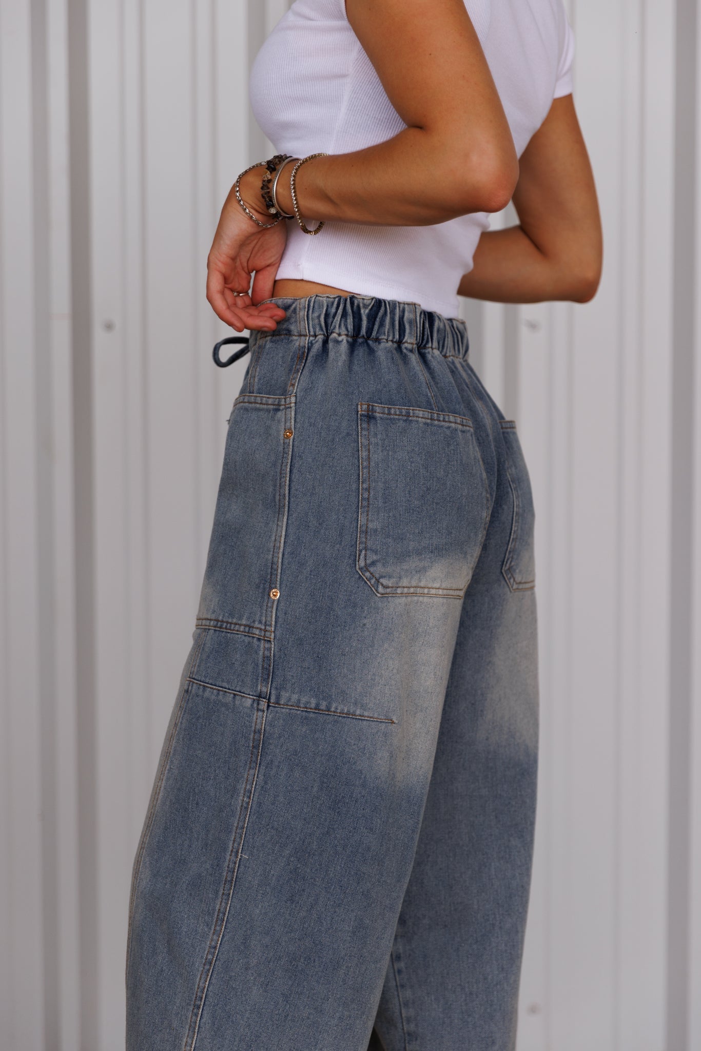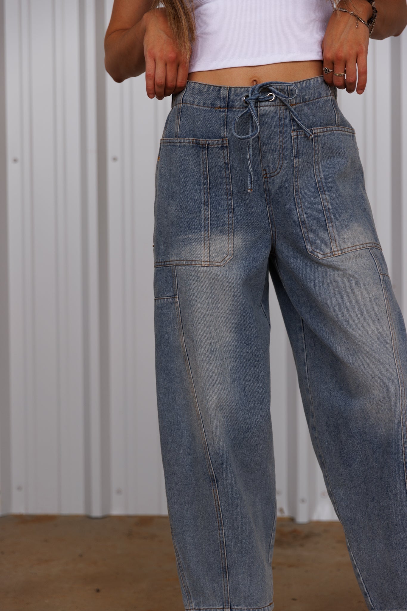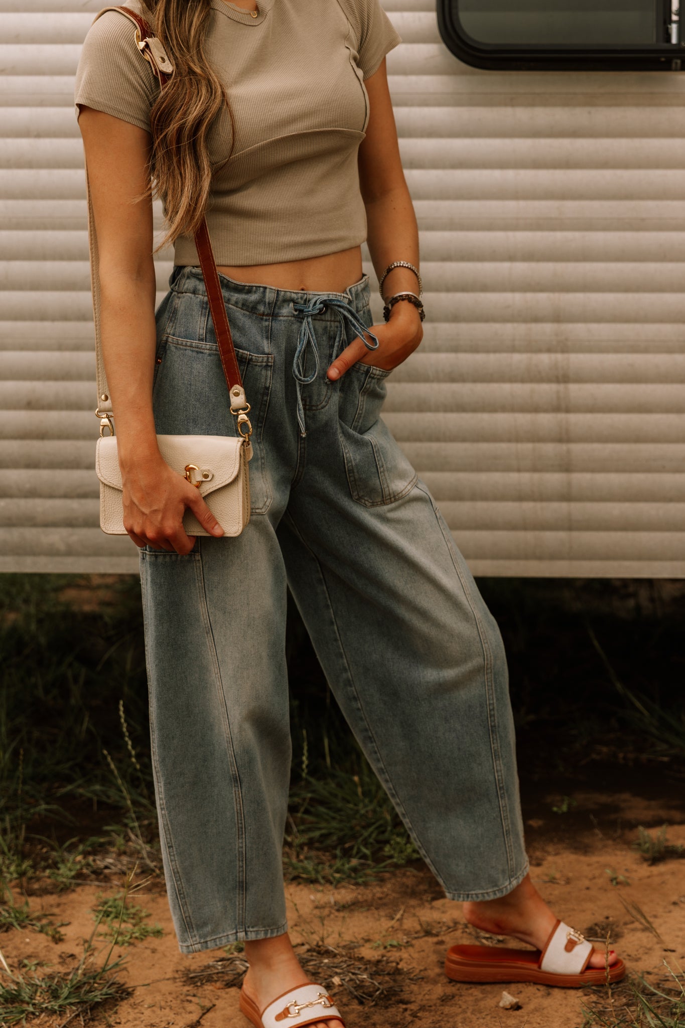 Your new go-to denim. These mid-rise, wide barrel leg jeans are a summer staple. Featuring deep front pockets, seam detailing, and drawstring tie, they are giving us the 'effortless chic' vibes of our dreams.