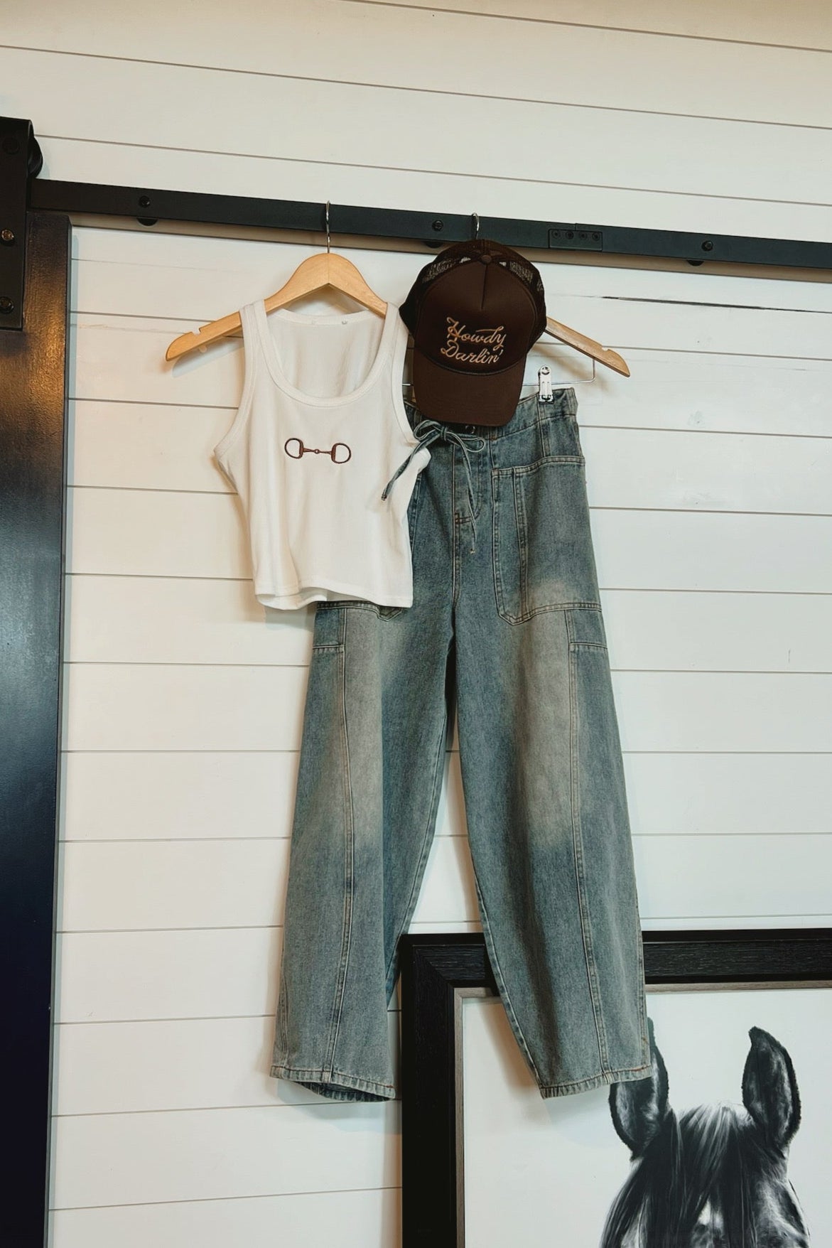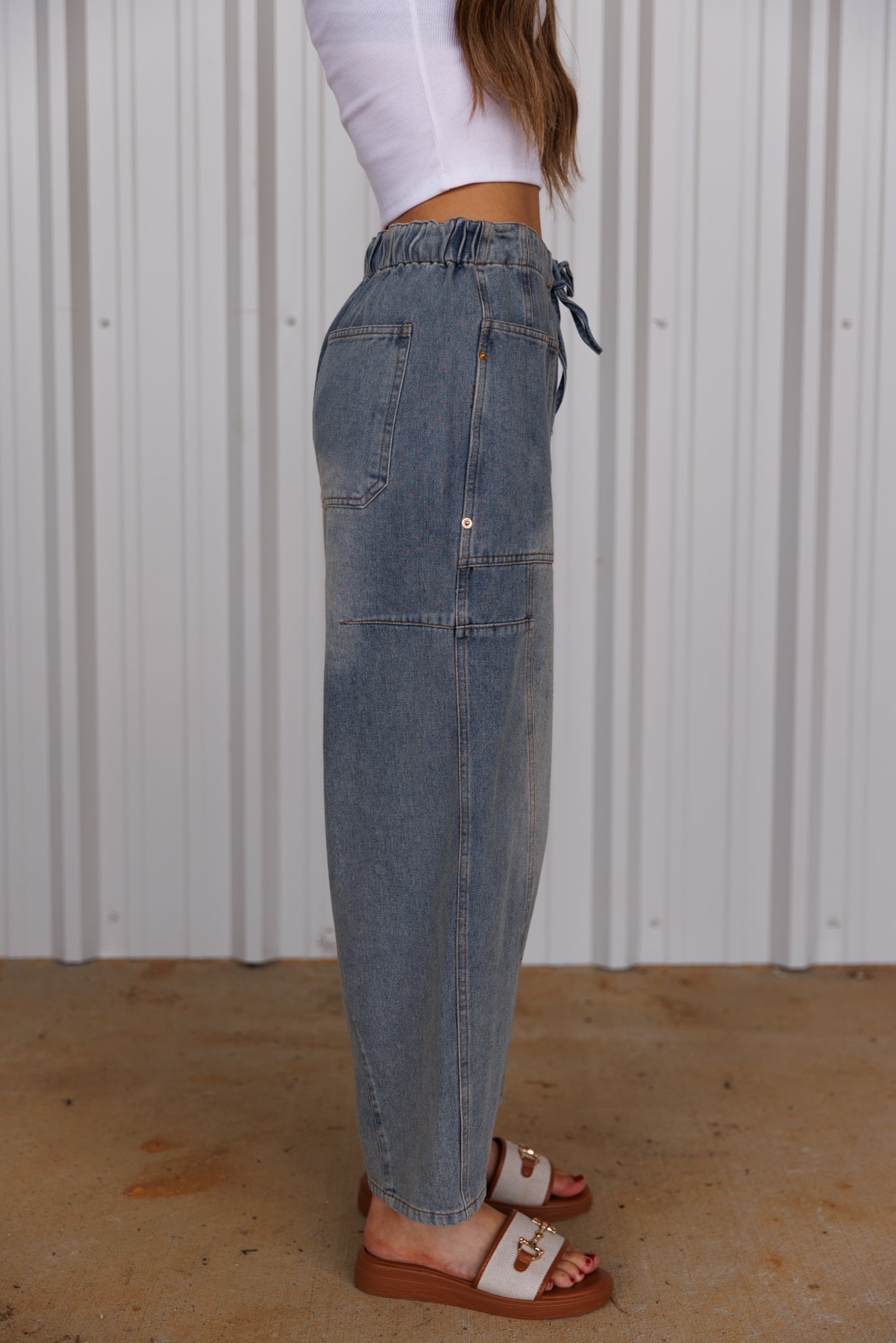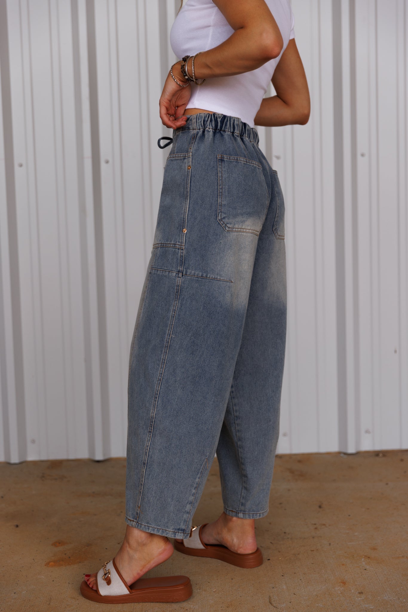 Your new go-to denim. These mid-rise, wide barrel leg jeans are a summer staple. Featuring deep front pockets, seam detailing, and drawstring tie, they are giving us the 'effortless chic' vibes of our dreams.