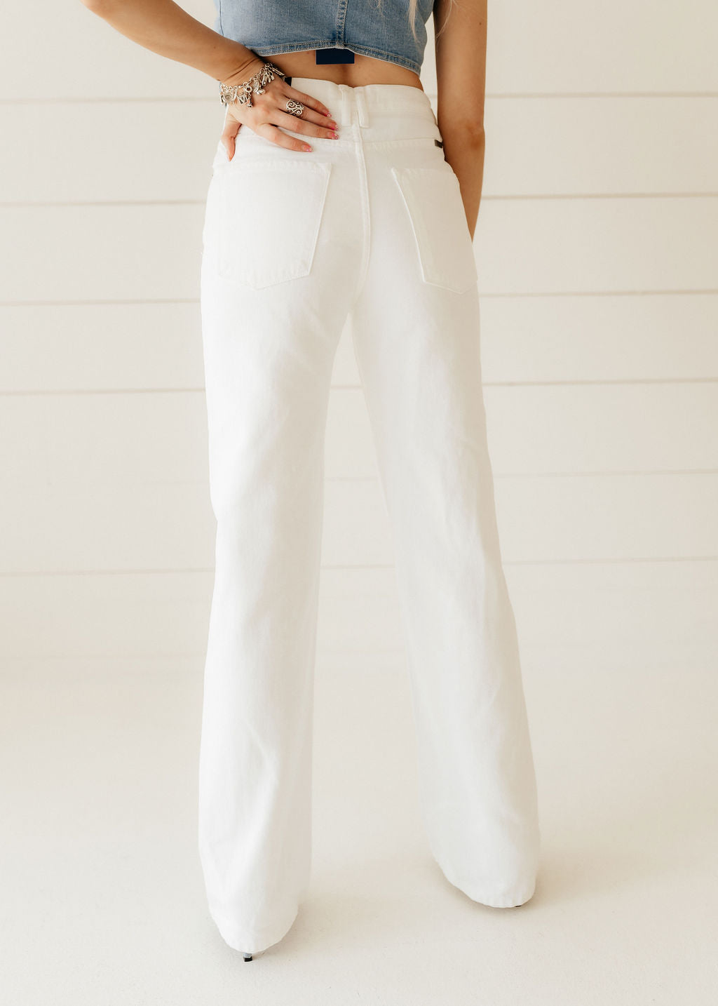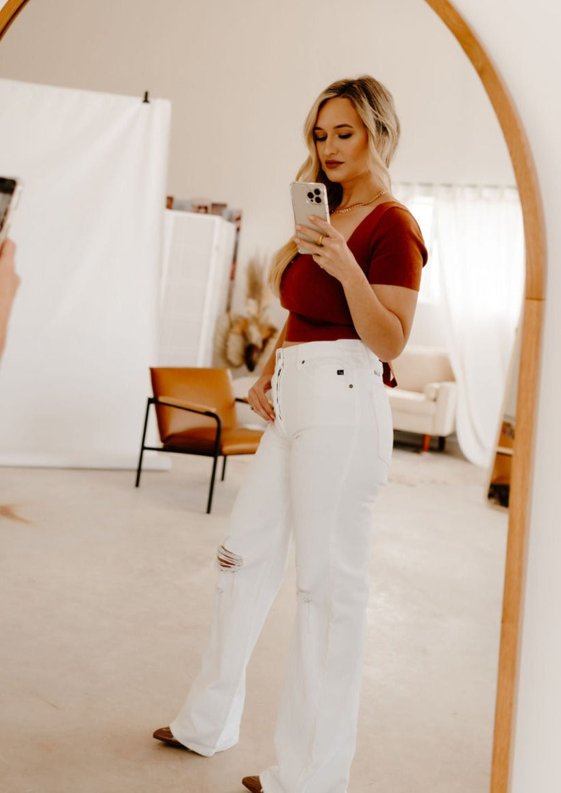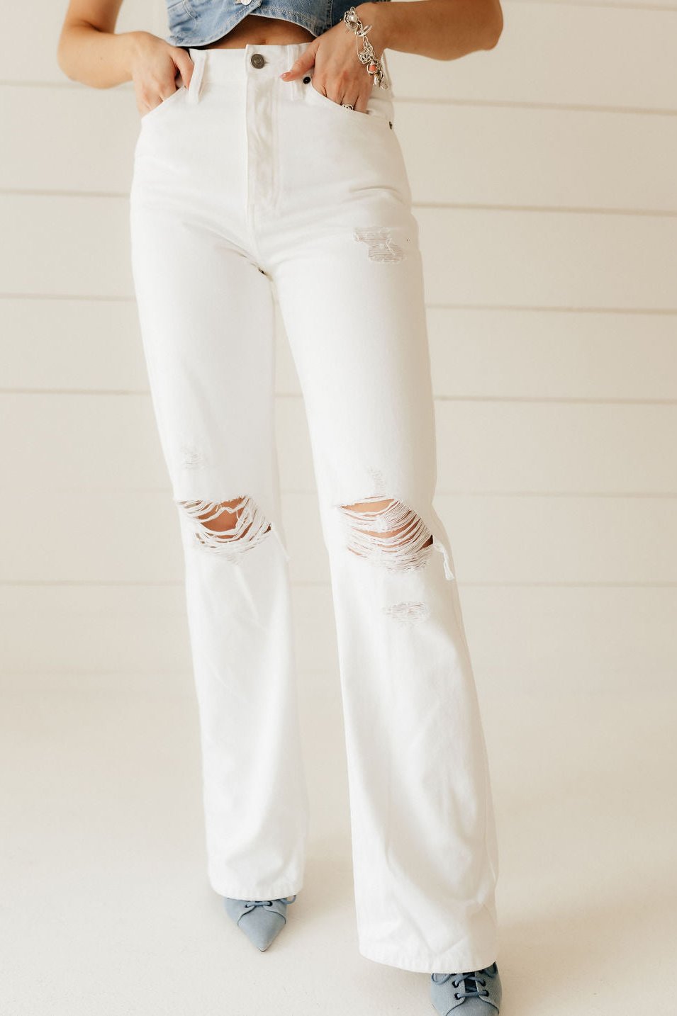 Your new favorite pair of white denim pants. These ultra high rise 90's style flare feature distressing at the knee, a hidden button fly, and a regular hem. Pair them with a graphic tee for a casual look, or add a blazer and hit the town.