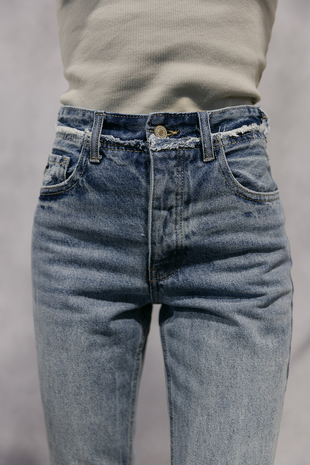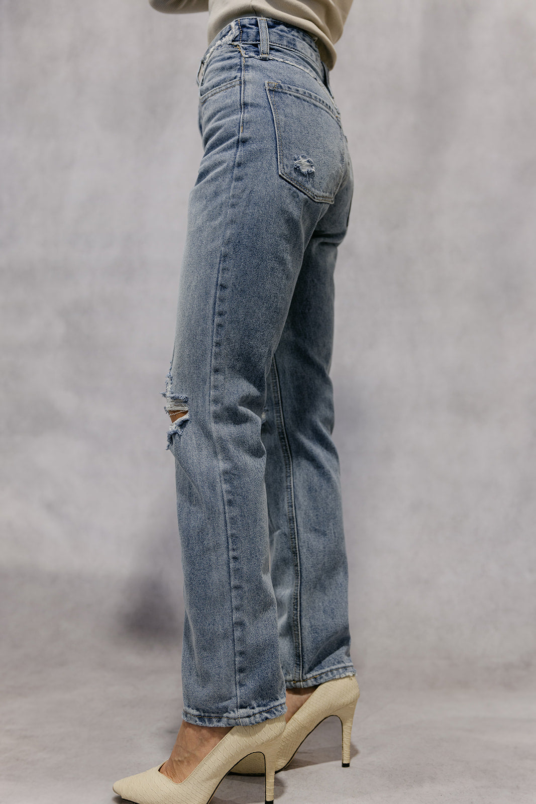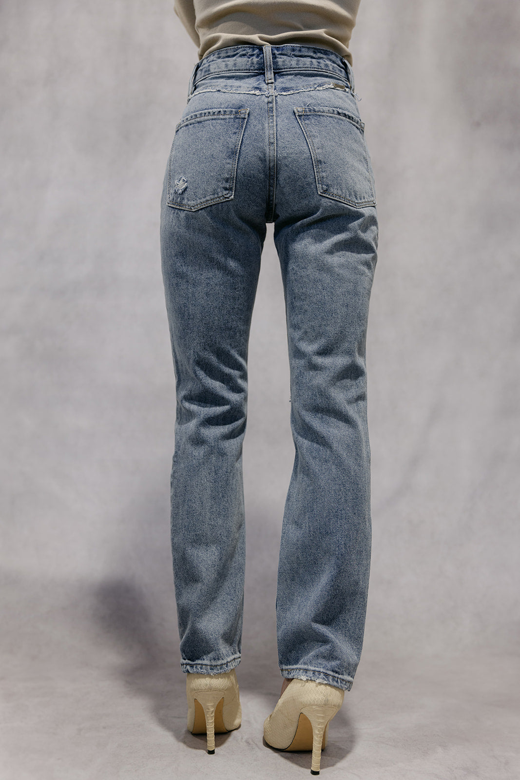 High-rise 90's straight leg jeans featuring a distressed look and hidden button closure.