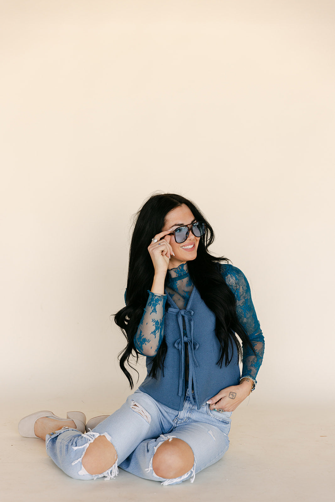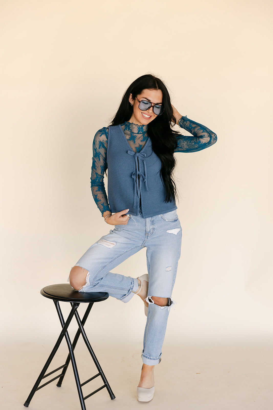 Knit material tie-front sweater vest that is perfect for layering, or even just wearing by itself.