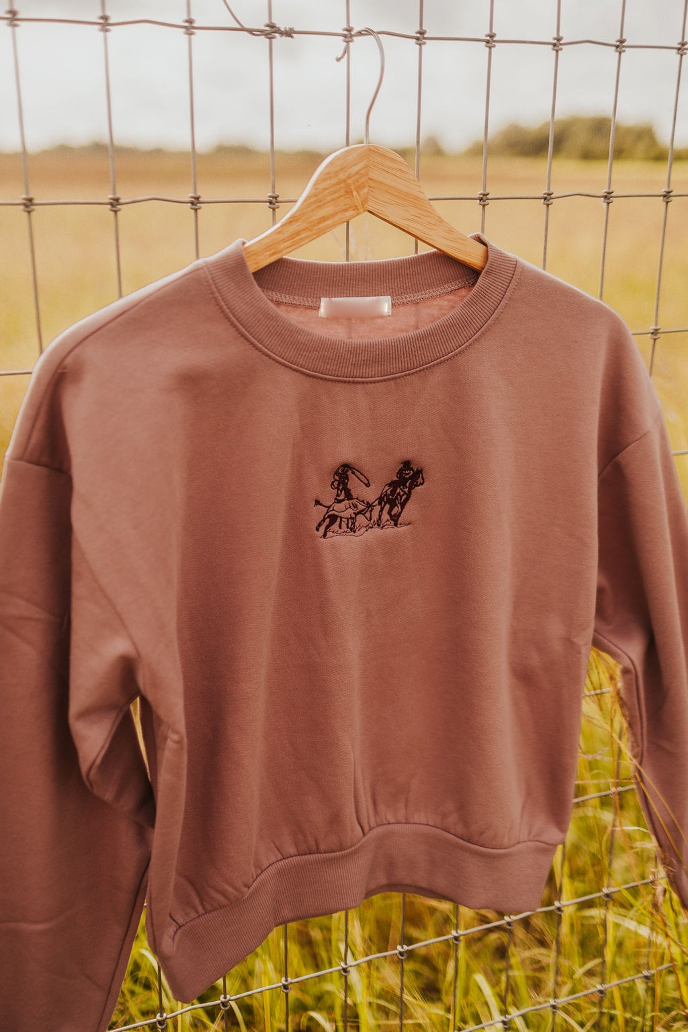 The kind of basic that still makes a statement. This soft cropped sweatshirt features long sleeves, a classic crew neckline, and an embroidered team roper front and center—bringing a little western grit to your wardrobe rotation.