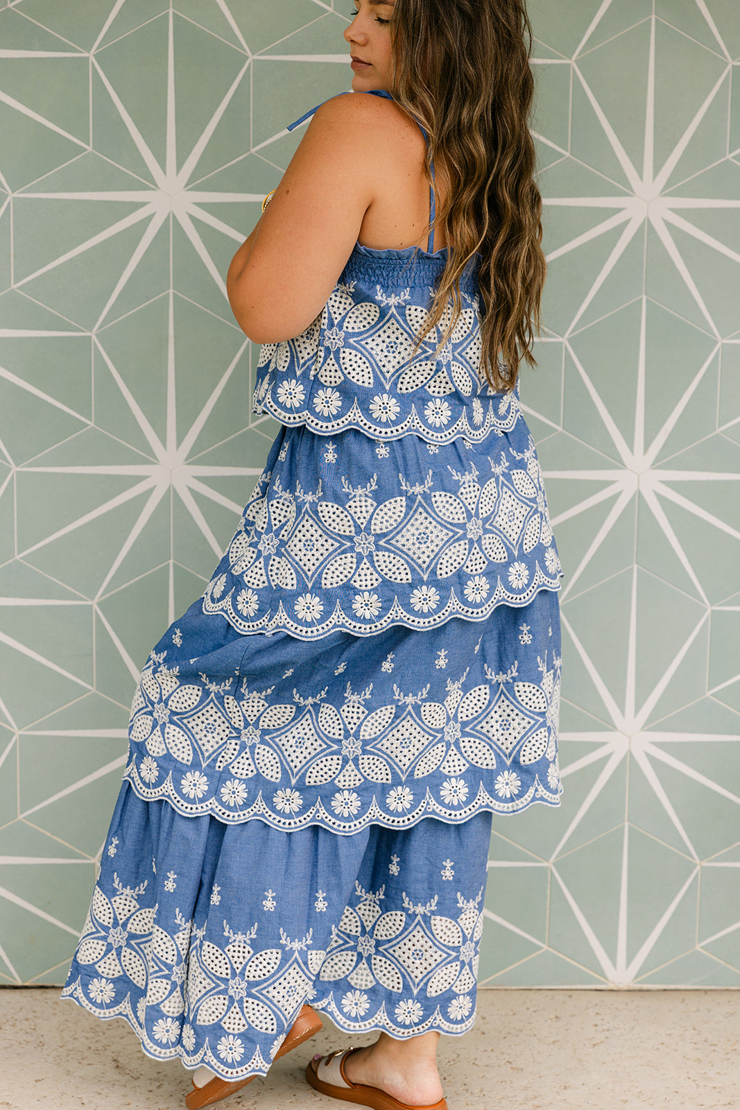 This matching set features a waist-length top with a square neckline and scalloped hem, paired with a coordinating high-rise skirt in embroidered eyelet fabric. Lightweight, breezy, and effortlessly feminine.